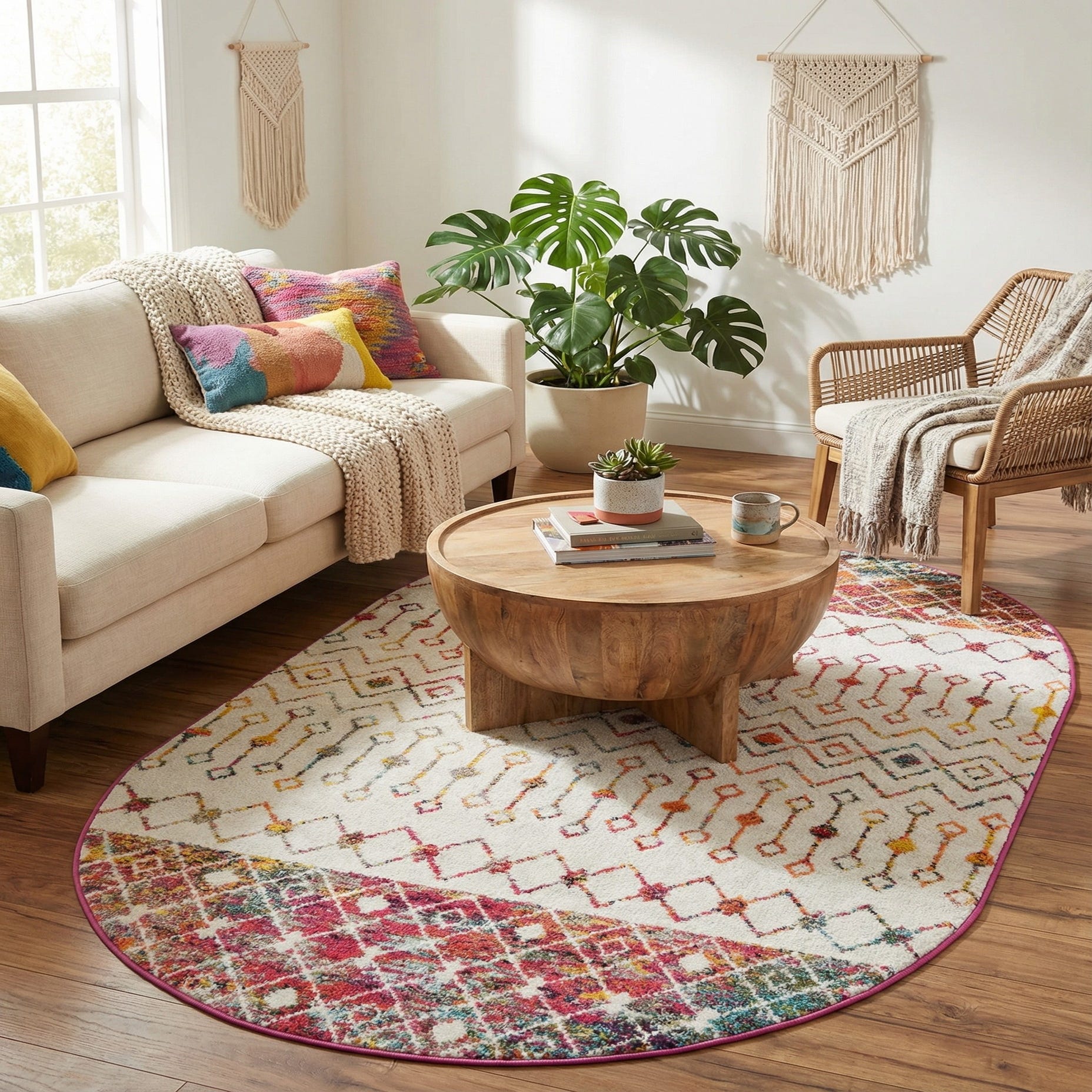 An oval 5'3" x 8'0" ivory bohemian rug with a vibrant multi-colored trellis pattern and a purple border.