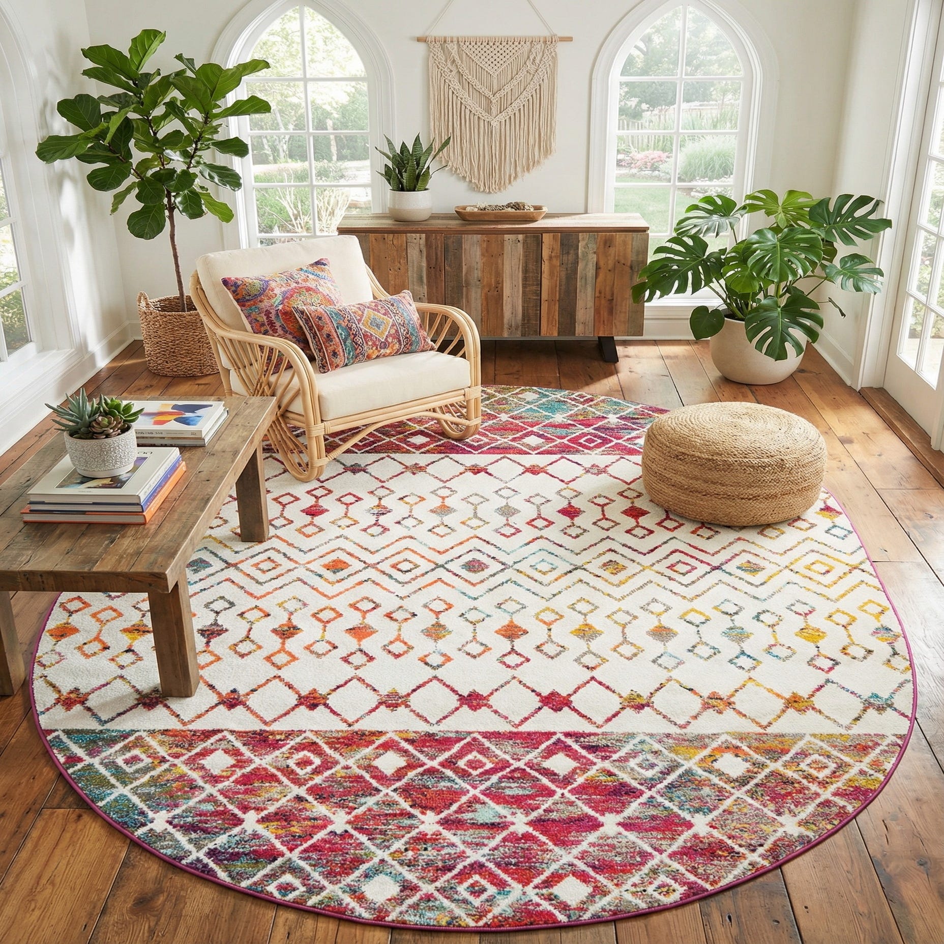 Bring this rug into a living area to ground a seating group, place it under a round dining table to soften angular furniture lines, or layer it in a bedroom to add warmth and color. Its mix of bright accents and an ivory field complements boho, eclectic, coastal, and contemporary transitional interiors; pair it with neutral upholstery to let the colors sing, or coordinate with bright pillows and artwork for a more playful, collected effect.