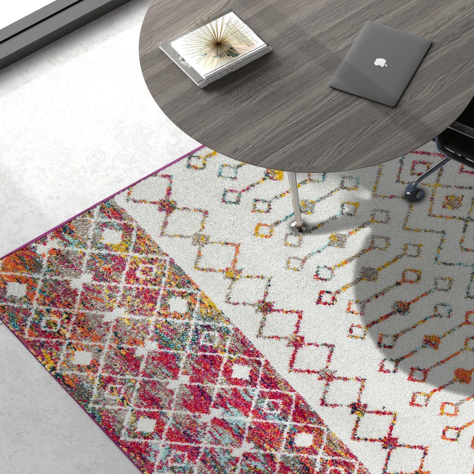 A 9x12 rectangular ivory area rug with a vibrant multi-colored bohemian trellis pattern, featuring diamond and zigzag motifs.