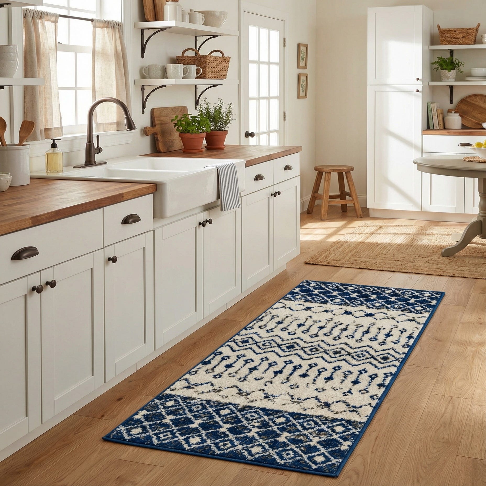 Place this runner in a high-traffic hallway to anchor a long circulation path, use it in a kitchen galley for a pop of pattern beneath a narrow table, or pair it with light wood floors and navy or gray accents for a coastal or transitional look. It also complements casual contemporary pieces—think linen sofas, brass hardware and mixed textiles—and works well layered over a low-profile rug to add pattern and warmth.