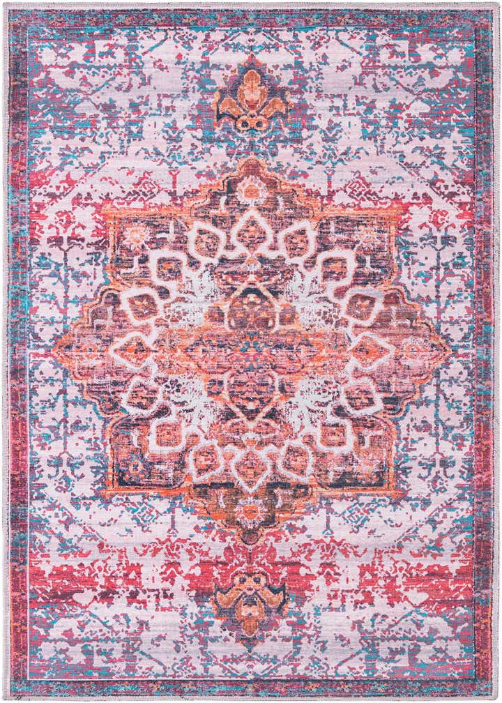 Primary color is Ivory Orange. Colors in this rug include: Ivory Orange, Black, Blue, Ivory, Orange, Red, Violet, Pink.