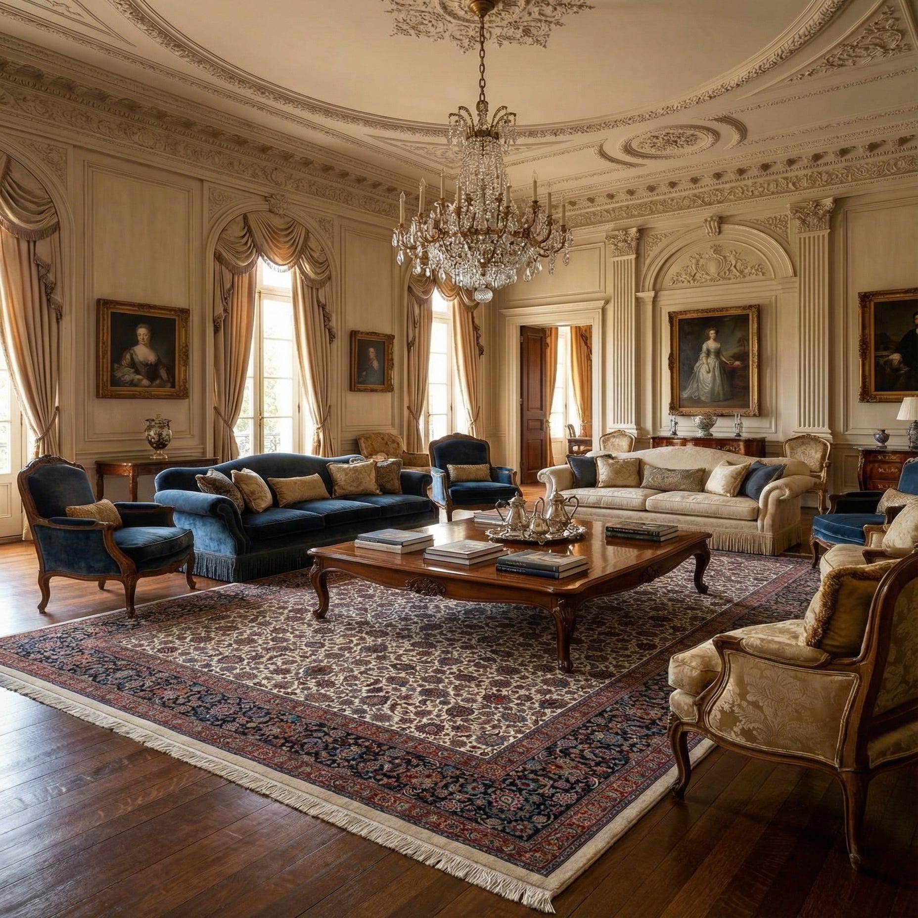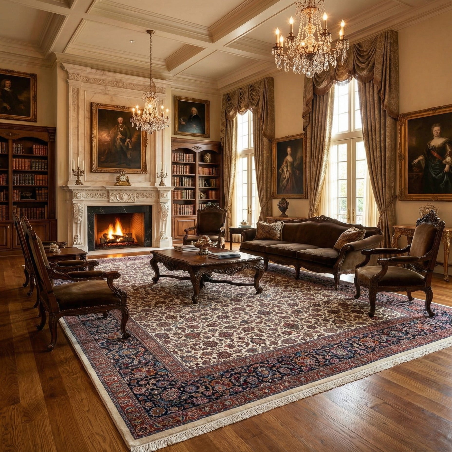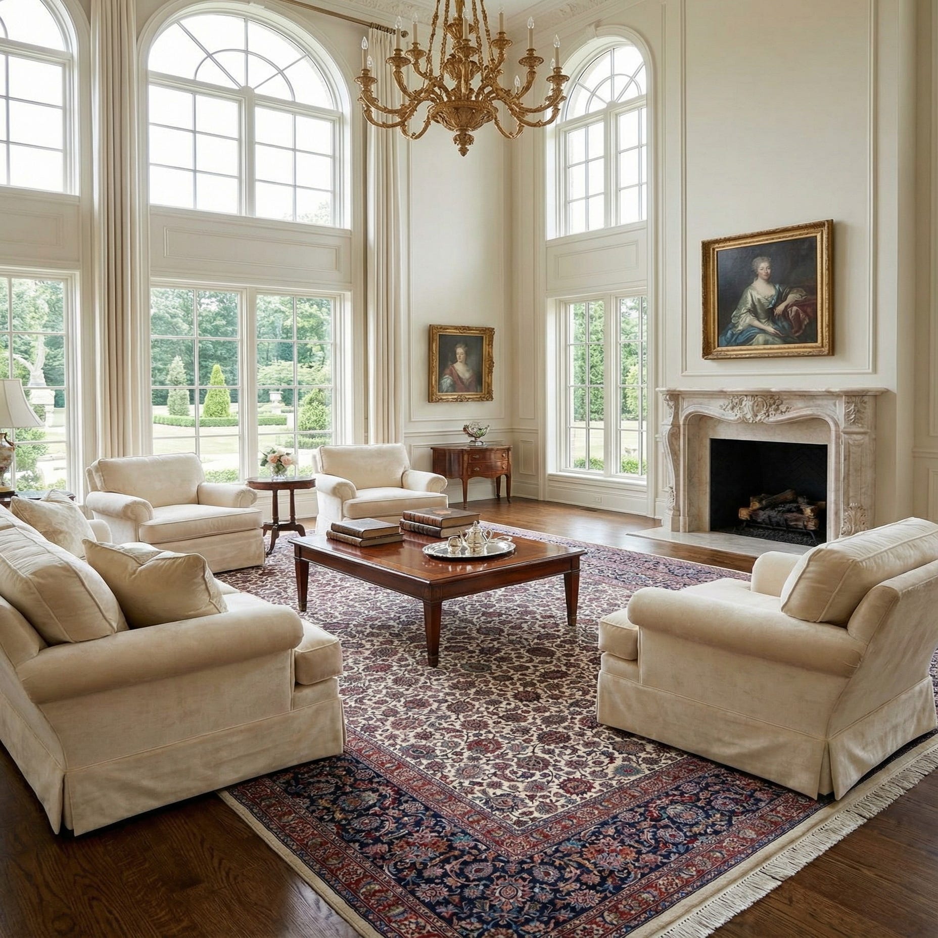 Rectangular ivory and cream palace rug with a dense botanical and floral Persian pattern, bordered by a dark navy and red traditional design.