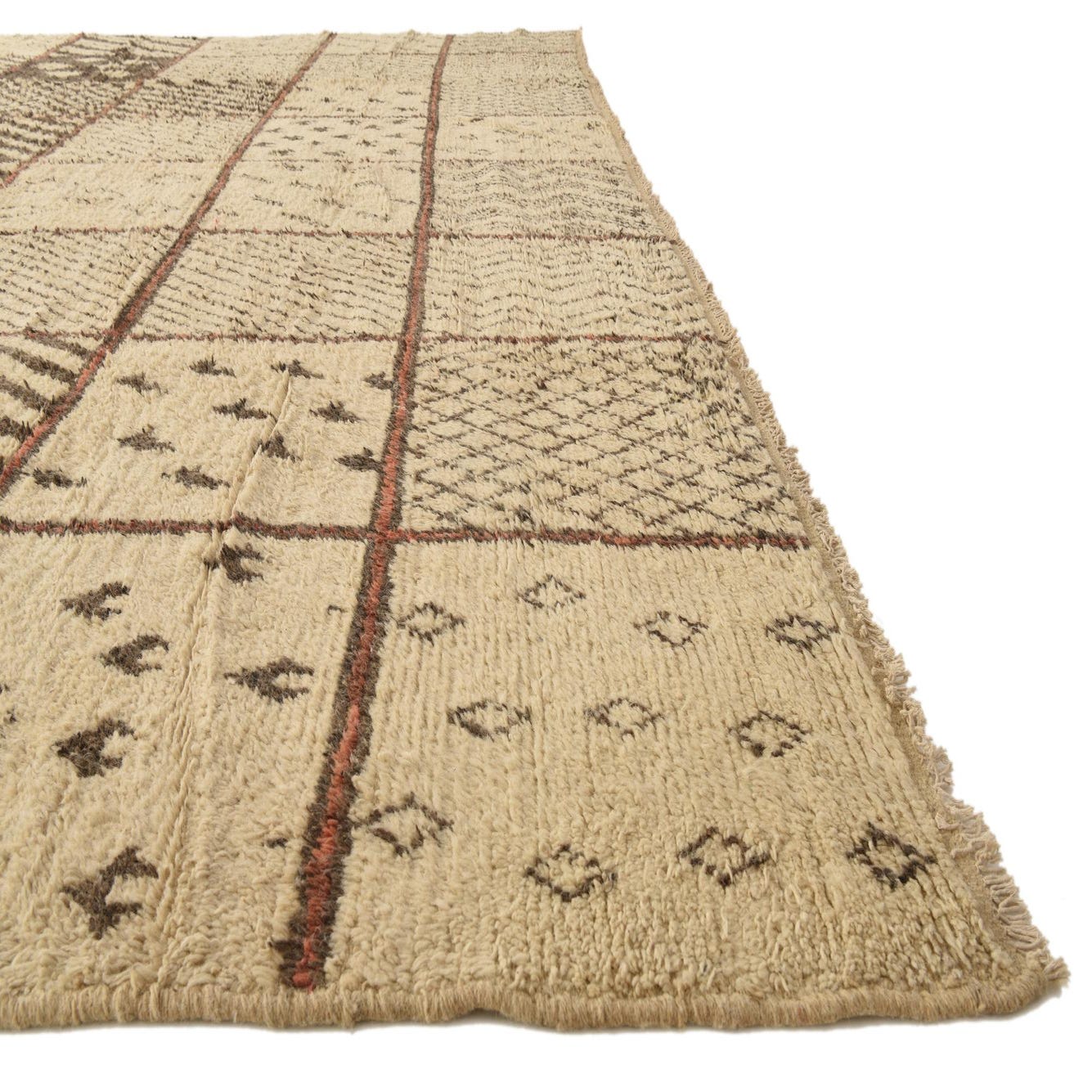 A large rectangular ivory and brown tribal shag rug with a patchwork of geometric patterns.