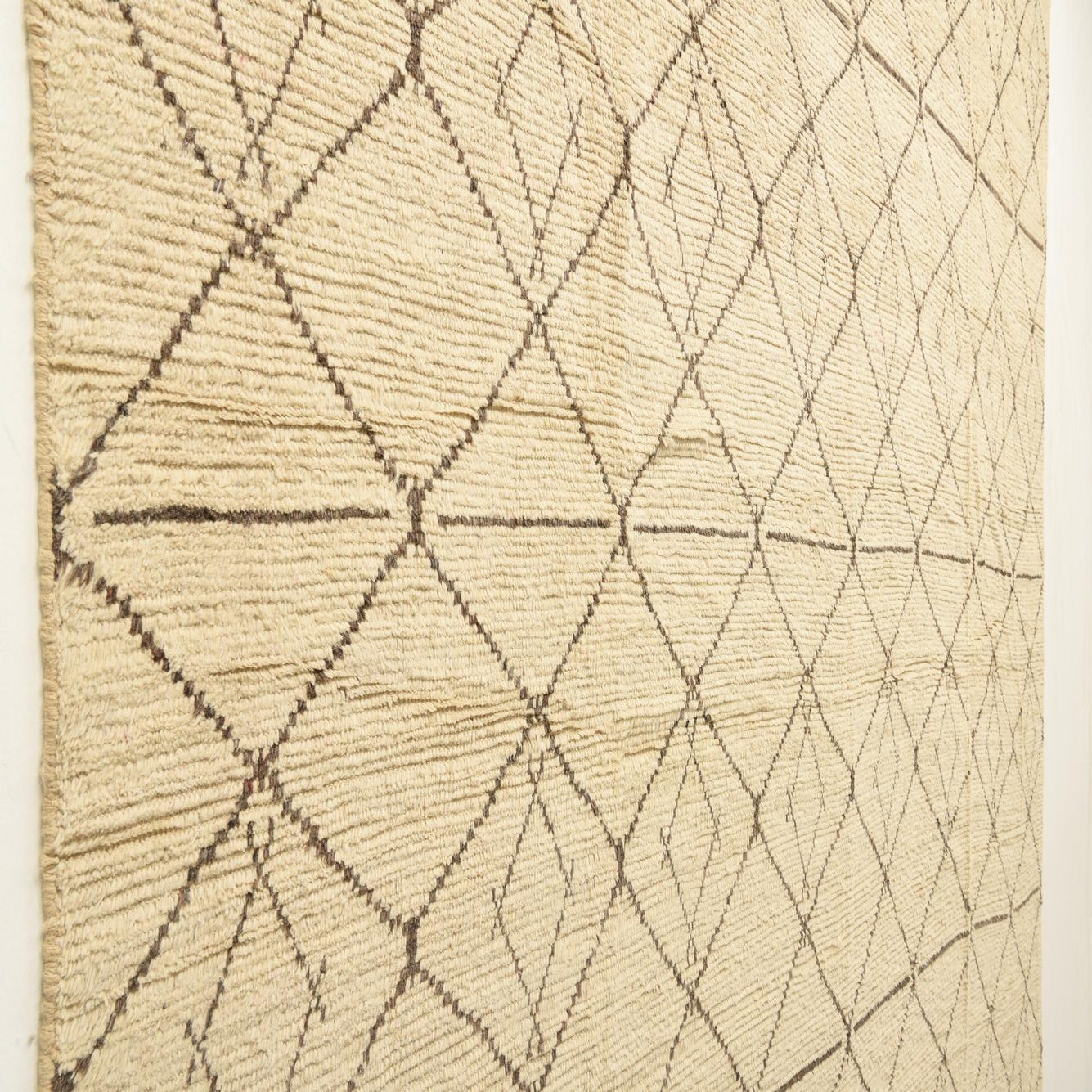 A rectangular ivory Moroccan shag rug with a repeating dark tribal diamond pattern, perfect for a living room or bedroom.