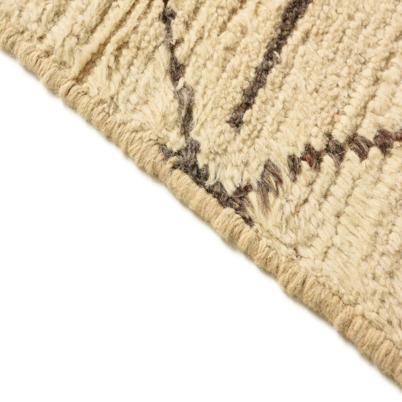 This Moroccan collection rug is a hand-knotted piece crafted from 100% wool, offering a luxuriously soft texture underfoot. The rug presents a geometric diamond pattern that provides a sense of structure and balance, with a base color of ivory elegantly complemented by brown detailing. Fringe edges add an extra level of detail, framing the design and enhancing its traditional handcrafted appeal.