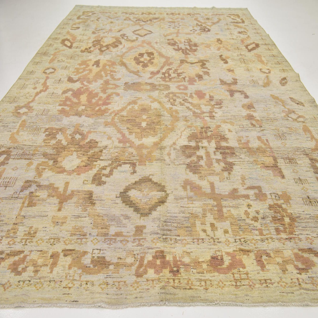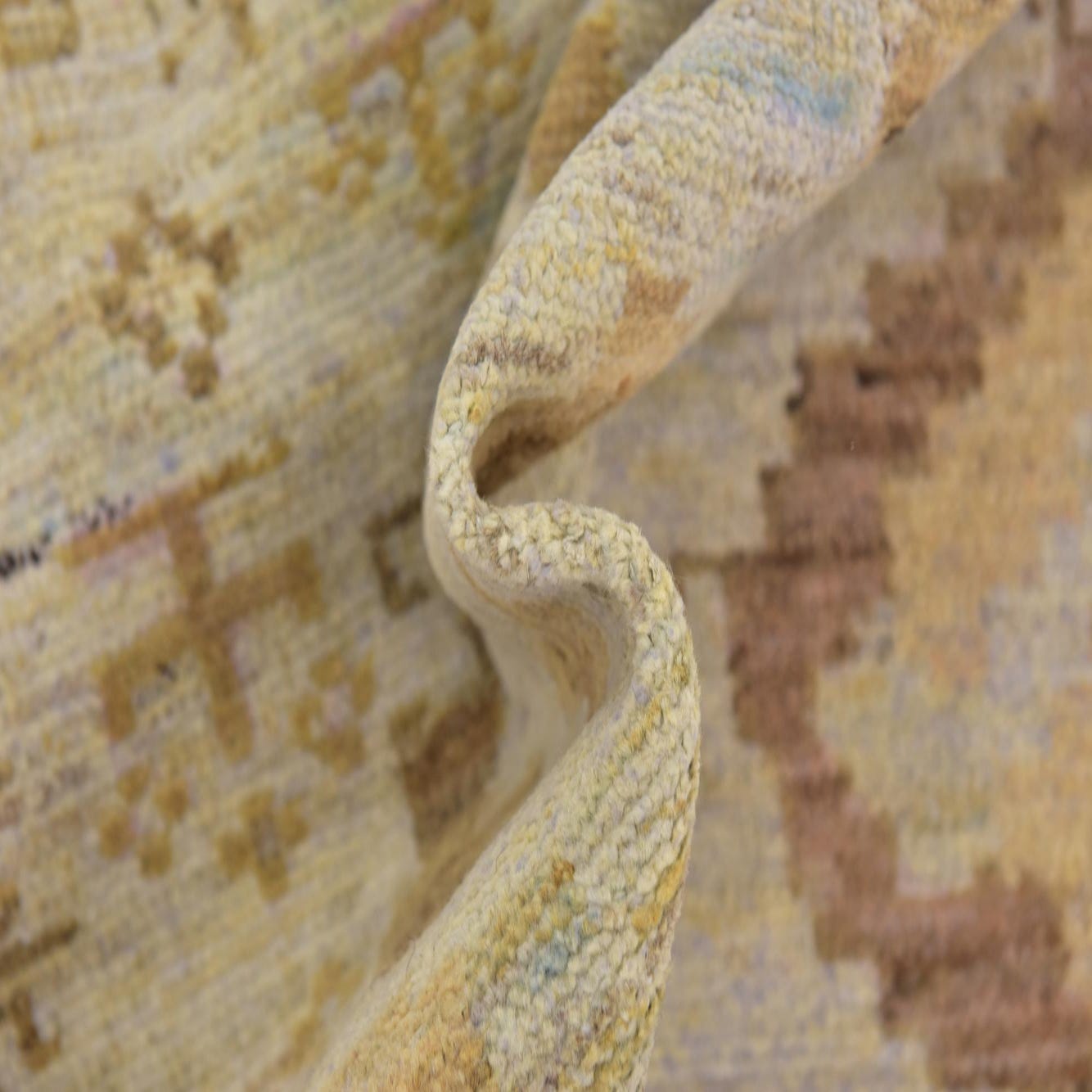 The Oushak Hand Knotted Palace Rug offers a harmonious blend of traditional design with a modern color palette, making it a versatile addition to any interior. Constructed of 100% wool, this rug ensures durability and a soft underfoot experience. The piece showcases a melange of warm and cool hues, including ivory, brown, cream, tan, peach, olive, and light blue, with ivory serving as the predominant background color, imbuing the space with a calm and grounded ambiance.