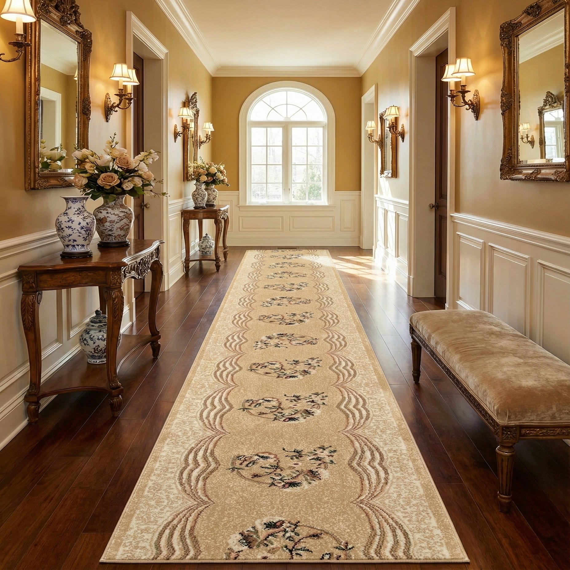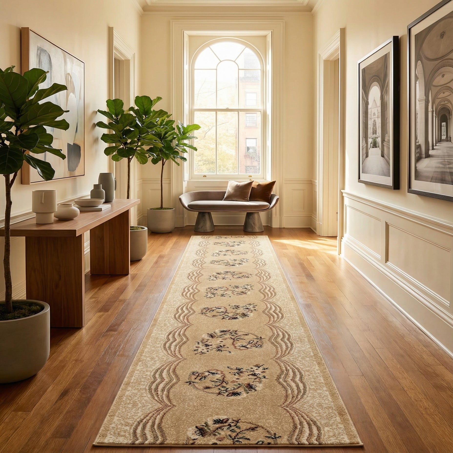 A rectangular Shahmir Palace runner rug in ivory and cream with a traditional oriental floral pattern and decorative border.