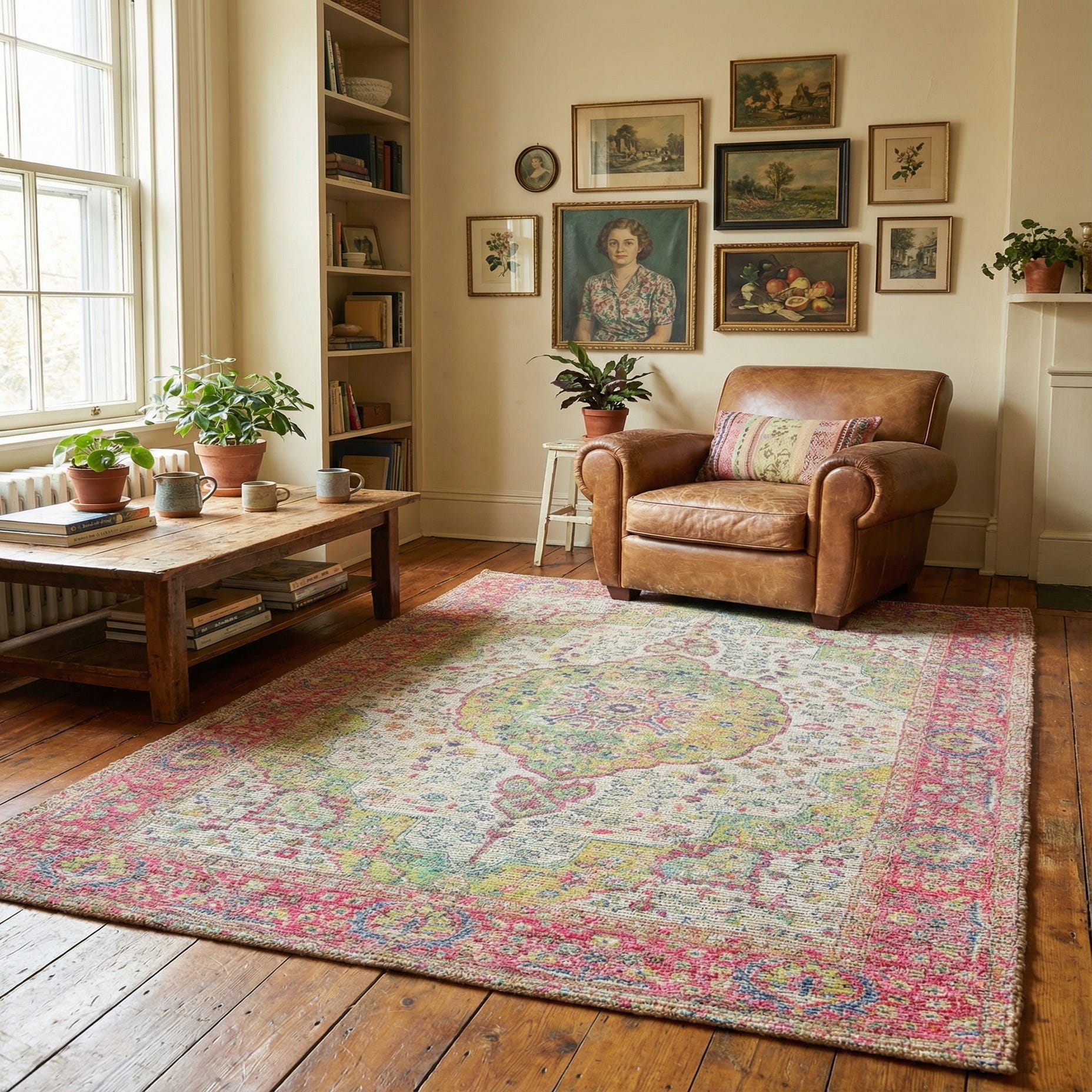 This piece works well in relaxed, colorful interiors — try it under a coffee table to warm a light-wood living room, layered beneath a neutral linen sofa for a soft pop of color, or at the foot of a bed to introduce gentle pattern and warmth. It also pairs nicely with rattan or wicker accents, navy and blush textiles, and mixed-pattern throws for an eclectic or cottage-inspired look, or as a lively anchor in a sunroom or youth bedroom.