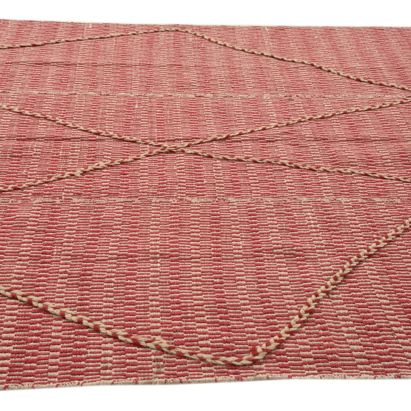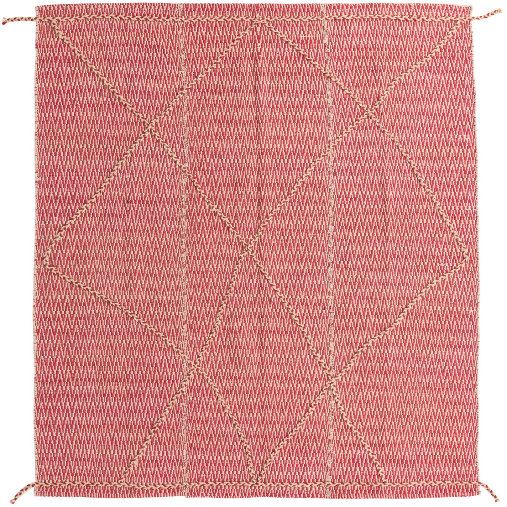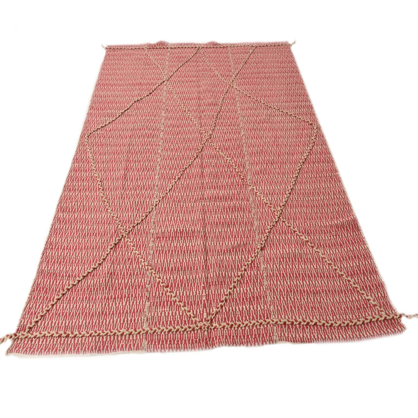 This Moroccan collection rug blends comfort and style with its hand knotted 100% wool construction. It measures 6x9, making it versatile for a variety of room sizes and settings. The rug features an Ivory Pink background, overlaid with a geometric pattern that provides a sense of movement and visual interest. The pattern is characterized by its simplicity and symmetry, which harmonizes well with the soft and inviting hue.