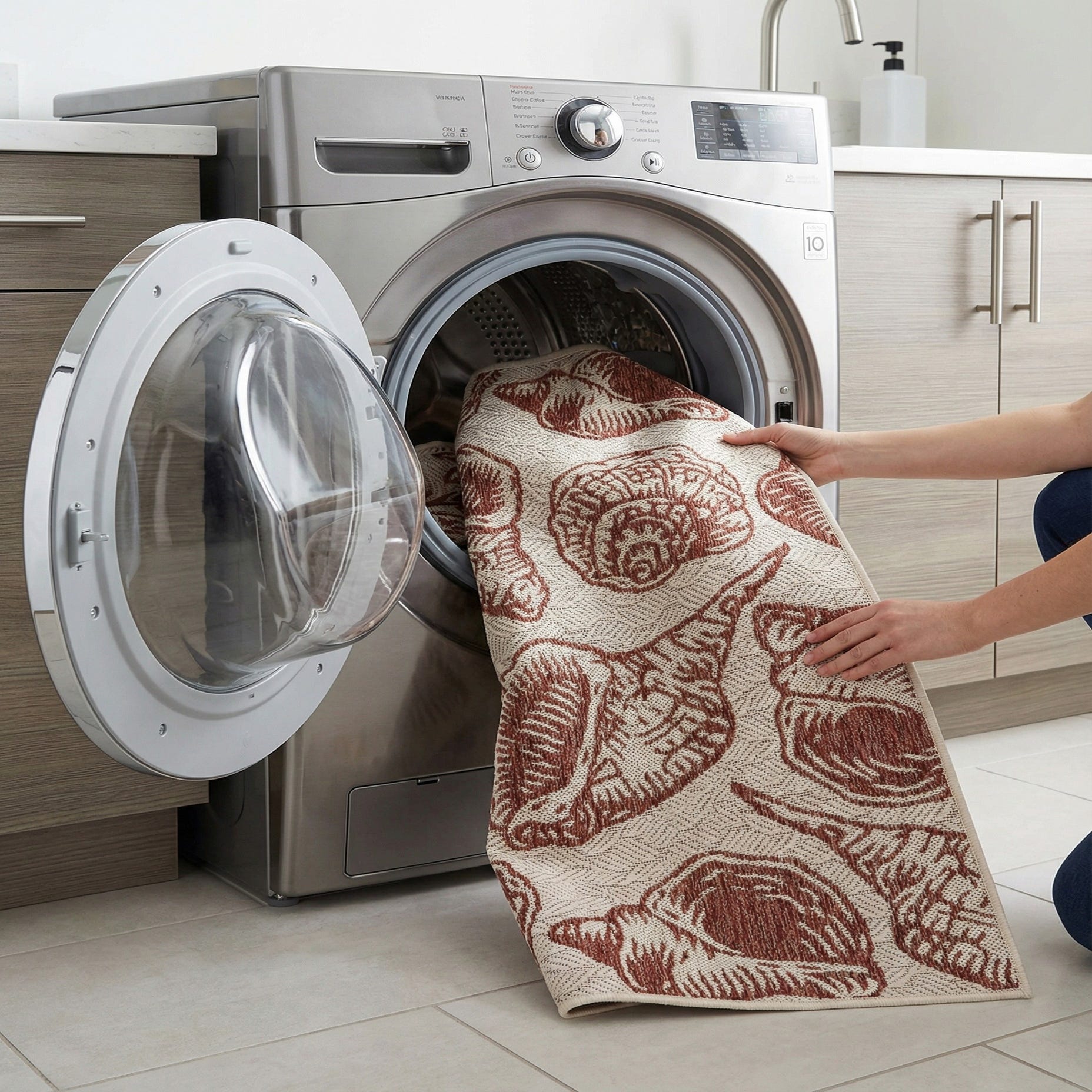 A 6 ft runner rug with a cream background and large, rustic red seashell patterns, ideal for a hallway or patio.