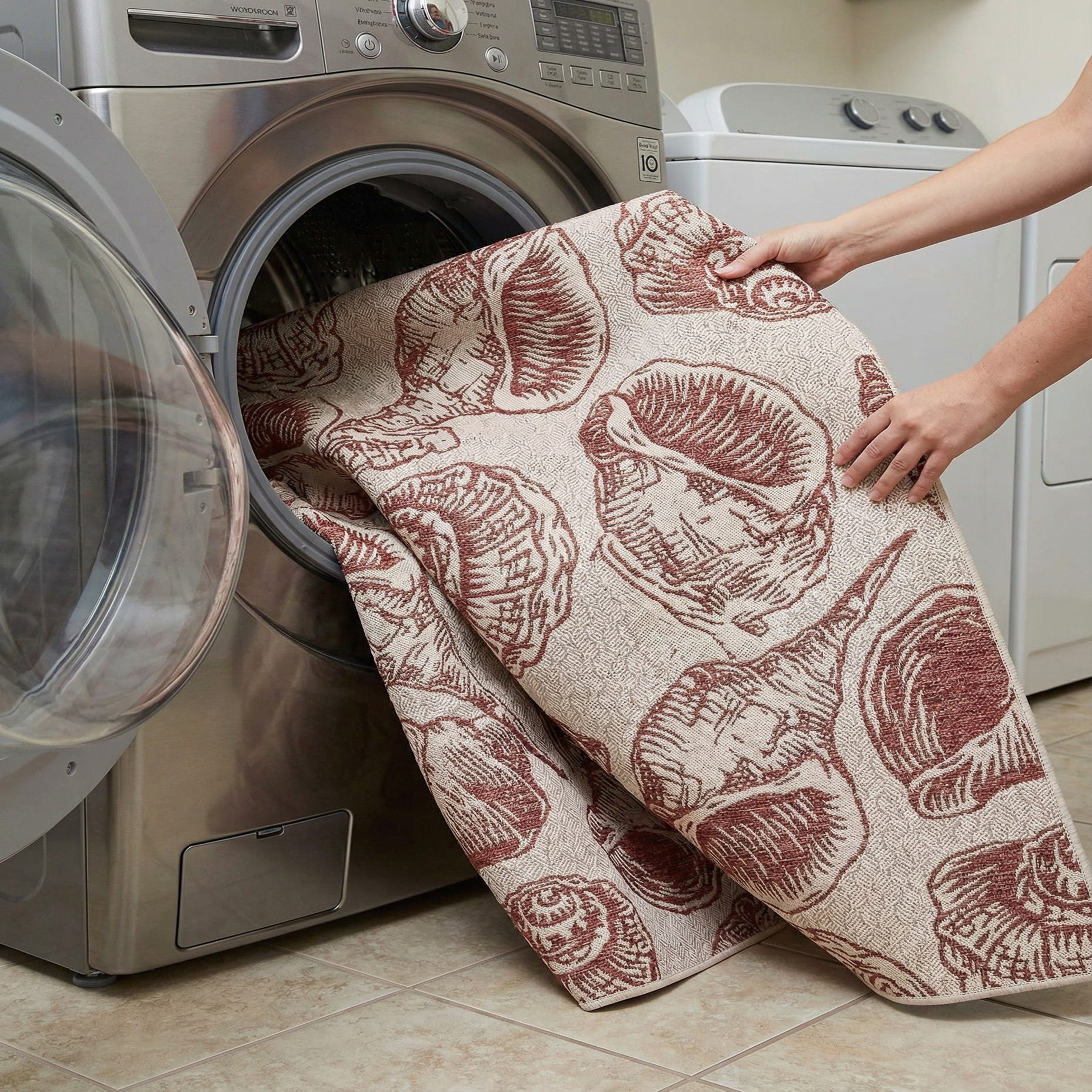 A repeat shell motif climbs across an Ivory Red field, rendered in a warm, rusty red that gives each conch and spiral a hand-illustrated look. The background carries a subtle wave-like weave that adds visual movement beneath the shells, while the low-profile, tightly woven surface offers a slightly textured hand you can feel underfoot. Machine made of 100% polypropylene, the rug balances clear pattern definition with the practical texture typical of outdoor-friendly weaves.