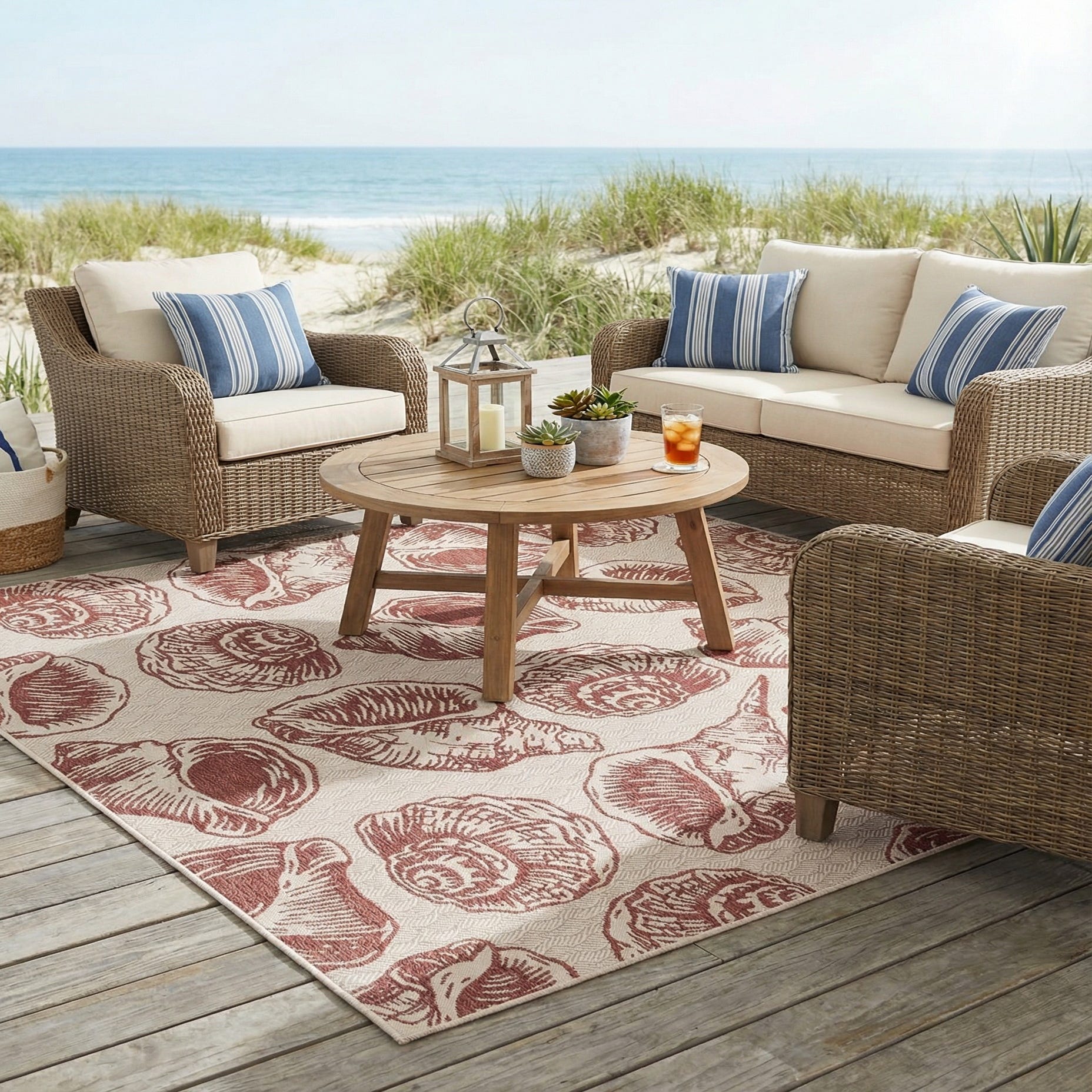 This piece pairs naturally with casual coastal, cottage, or transitional settings—think a covered patio or sunroom anchored by whitewashed wood and woven rattan furniture, or a breezy dining area accented with navy and sandy neutrals. Rust-red accents in pillows, planters, or ceramic pieces will tie into the shell motif, while layered textures like linen throws and seagrass baskets enhance the relaxed, seaside mood.