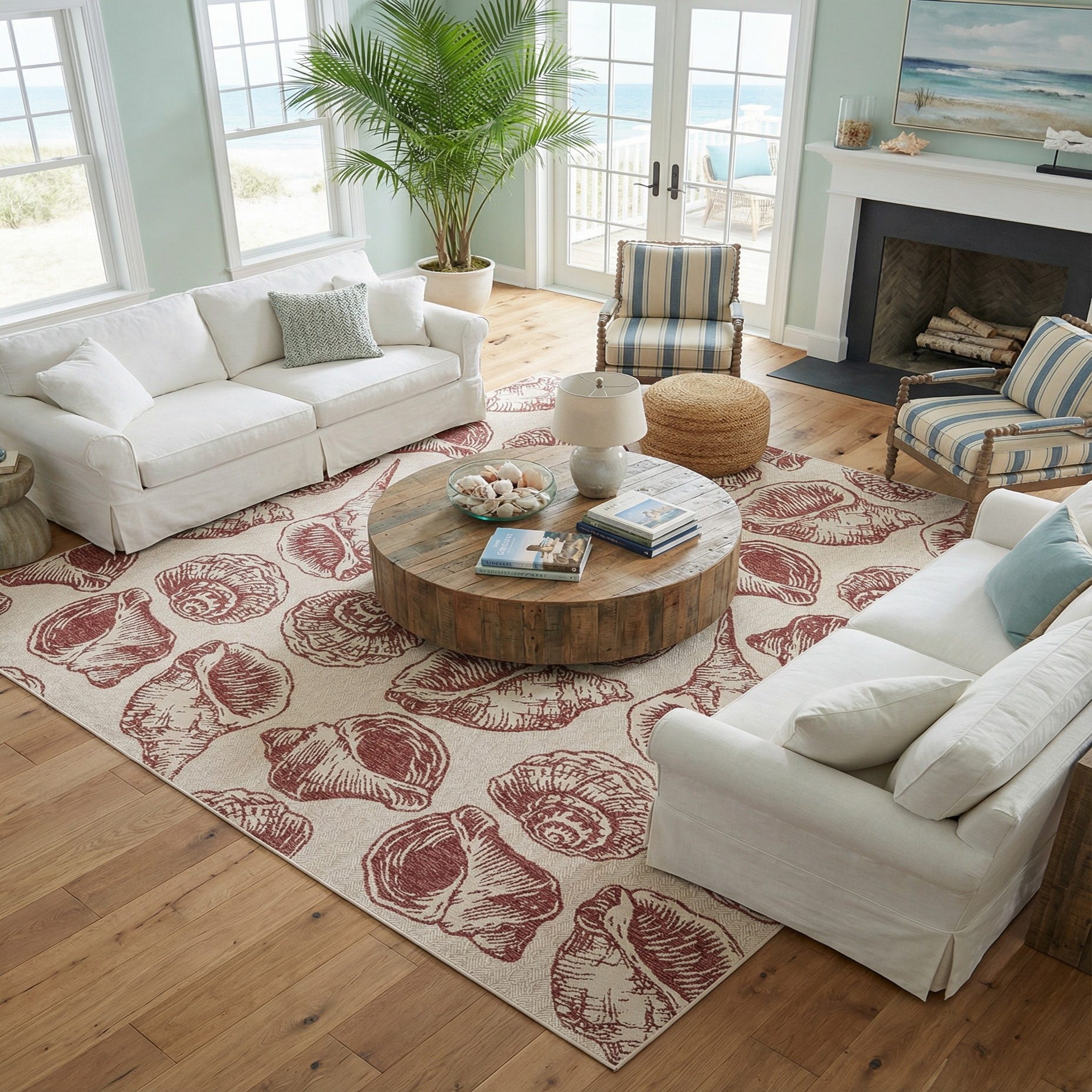 This rug works well on a sun-drenched porch, layered under a casual outdoor dining set, or placed in a coastal-themed living room or screened-in lanai. Pair it with weathered wood furniture, white wicker or rattan pieces, and accents in navy or sea-glass tones to complete a relaxed, seaside palette. The sketch-like motif also complements linen upholstery and woven textiles for an approachable, curated look.