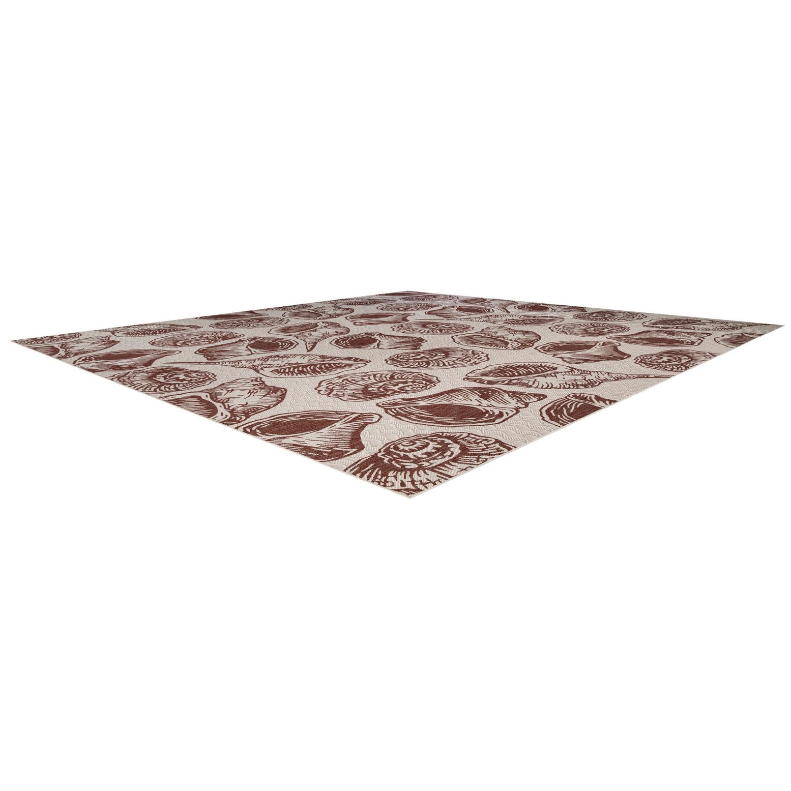 A square ivory and rust red rug featuring a repeating pattern of various seashell illustrations, perfect for a coastal patio.
