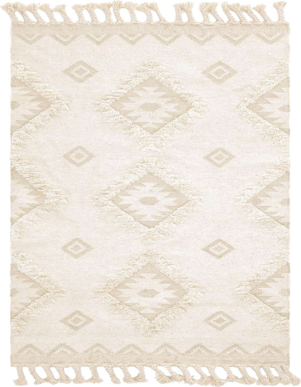 Ivory provides a soft, neutral field for a modest beige geometric motif made up of diamond medallions and smaller lozenges. The design is built with a combination of flat-woven areas and raised, tufted outlines that form shaggy diamond frames, while tasseled ends add a relaxed, hand-finished touch. Hand-woven of 100% wool, the rug has a warm, natural feel underfoot with a pleasing contrast between the low pile background and the textured, slightly lofted pattern.