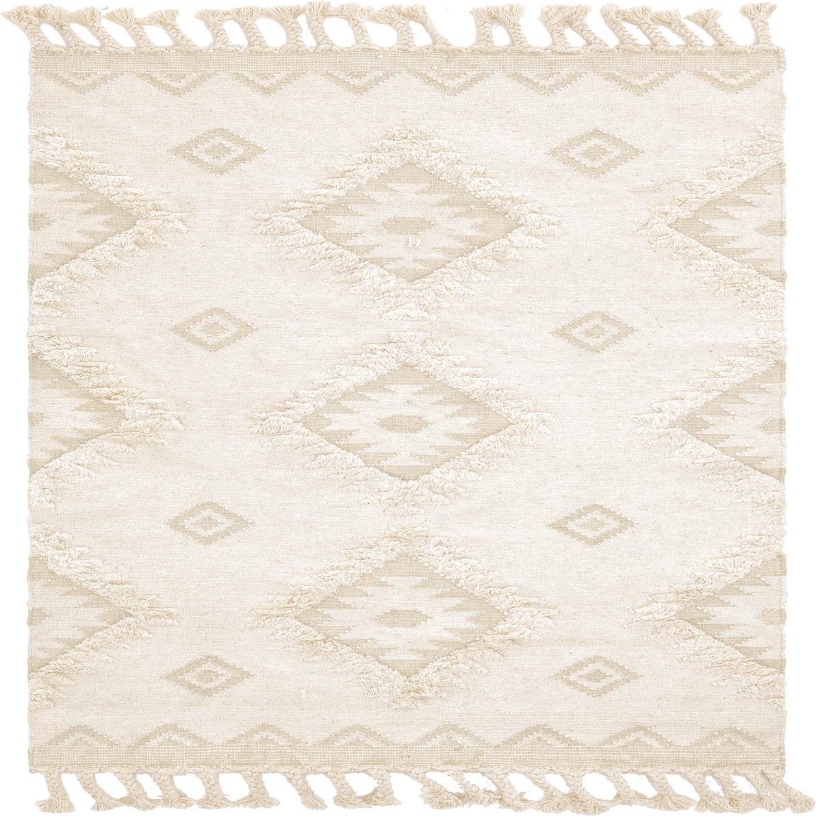 A rectangular 1' 6 x 1' 6 sample rug in ivory and cream with a textured Southwestern Bohemian tribal pattern and fringed edges.