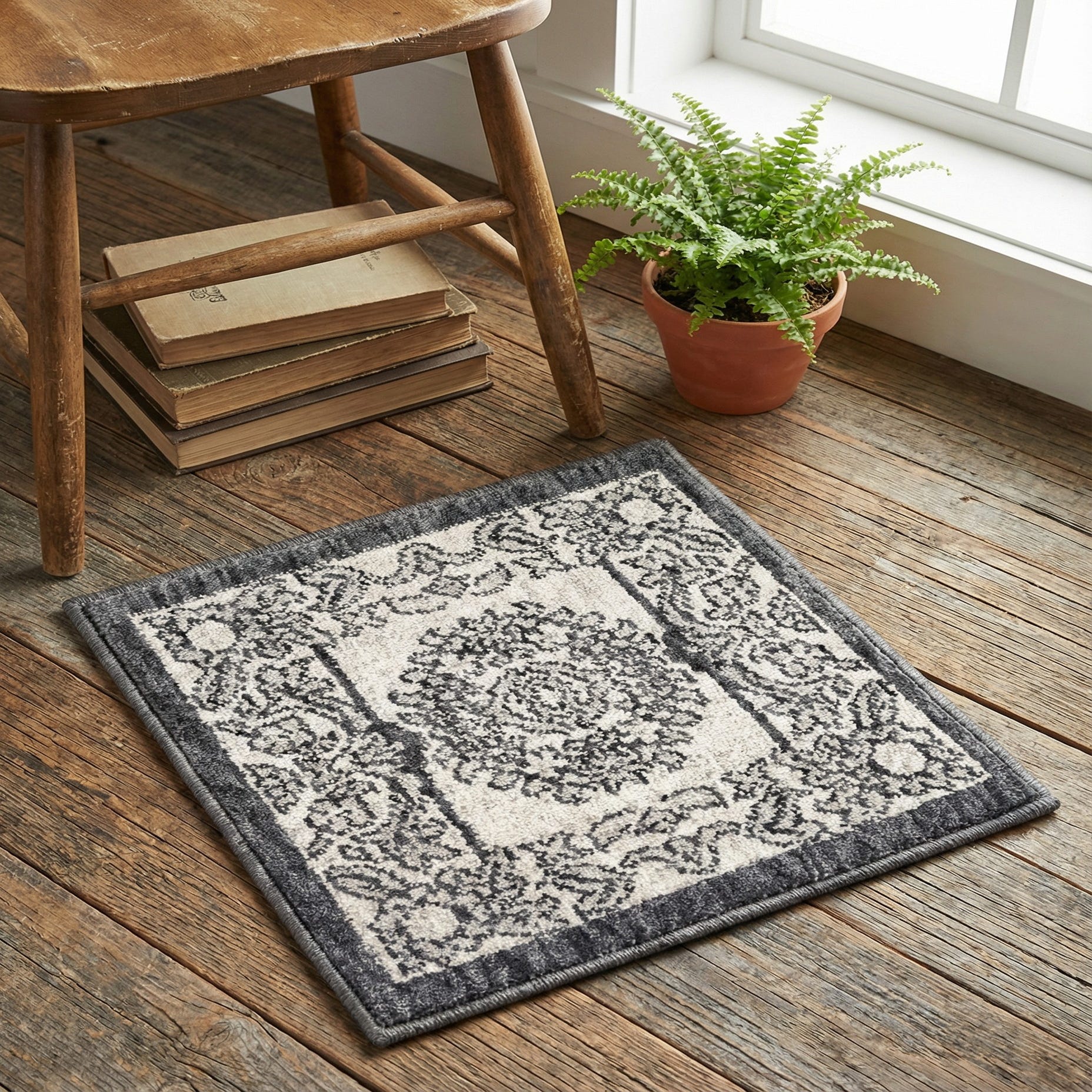 An ivory ground anchors a traditional medallion pattern framed by an ornate border in shades of gray, black and warm beige. Floral and arabesque motifs are rendered with a slightly distressed look that keeps the design authentic without feeling heavy; a darker outer band provides clear definition and contrast against the light background. Machine-made from 100% recycled space-dyed polyester, the rug has a low- to medium-height, dense pile with a gently textured surface that feels soft to the touch while preserving crisp pattern detail.