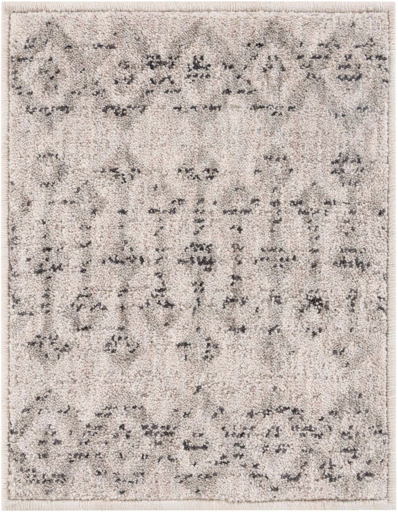 Machine-made from 100% recycled space-dyed polyester, this sample has an ivory ground threaded with charcoal and gray accents that form a softly distressed geometric pattern. The space-dyed yarn gives subtle tonal variation, so the darker markings have a slightly mottled, vintage-worn look against the light background. The overall effect is calm and understated, with enough visual interest to anchor a room without dominating it.