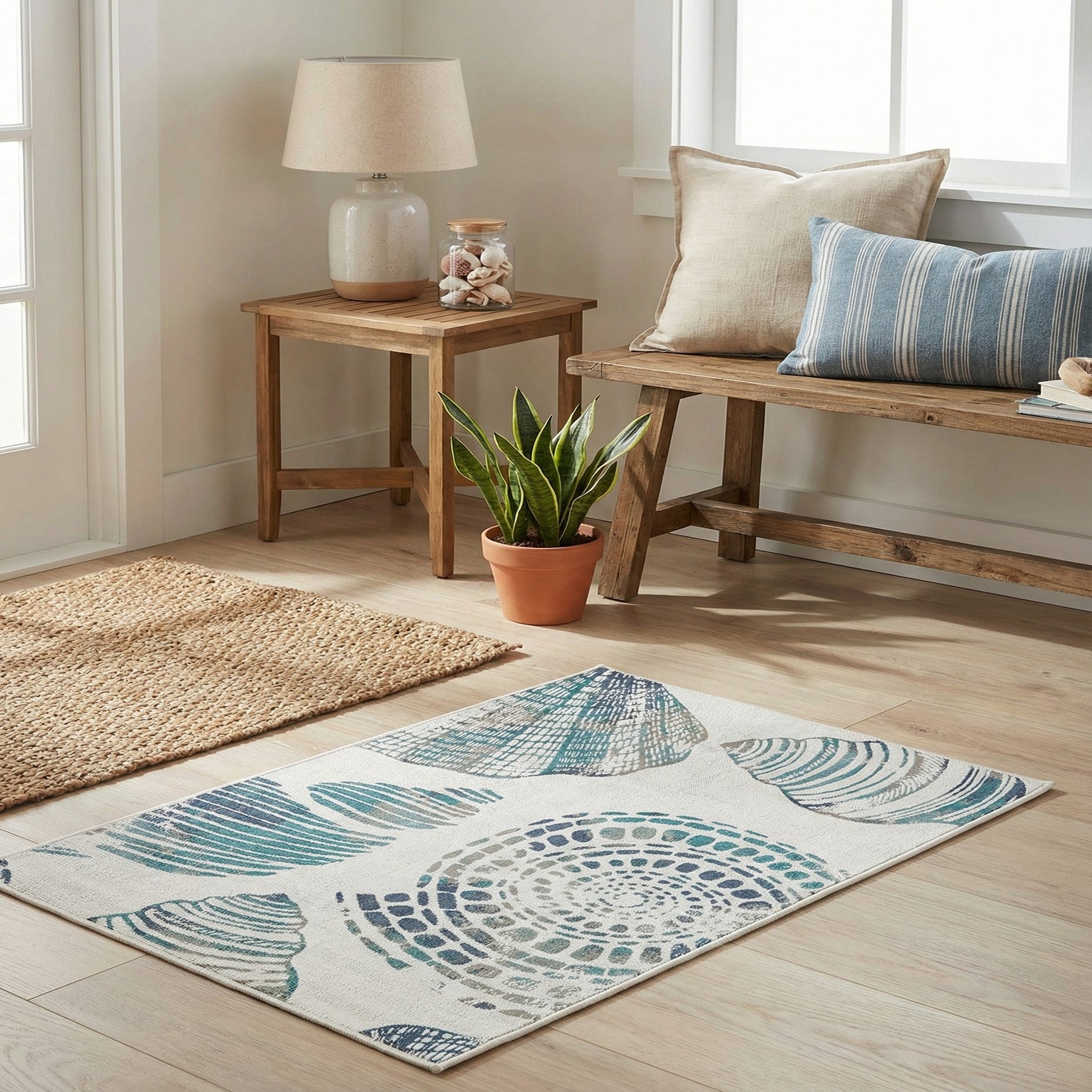 Rectangular ivory rug sample with large teal, blue, and grey seashell and spiral patterns, showcasing a coastal design.
