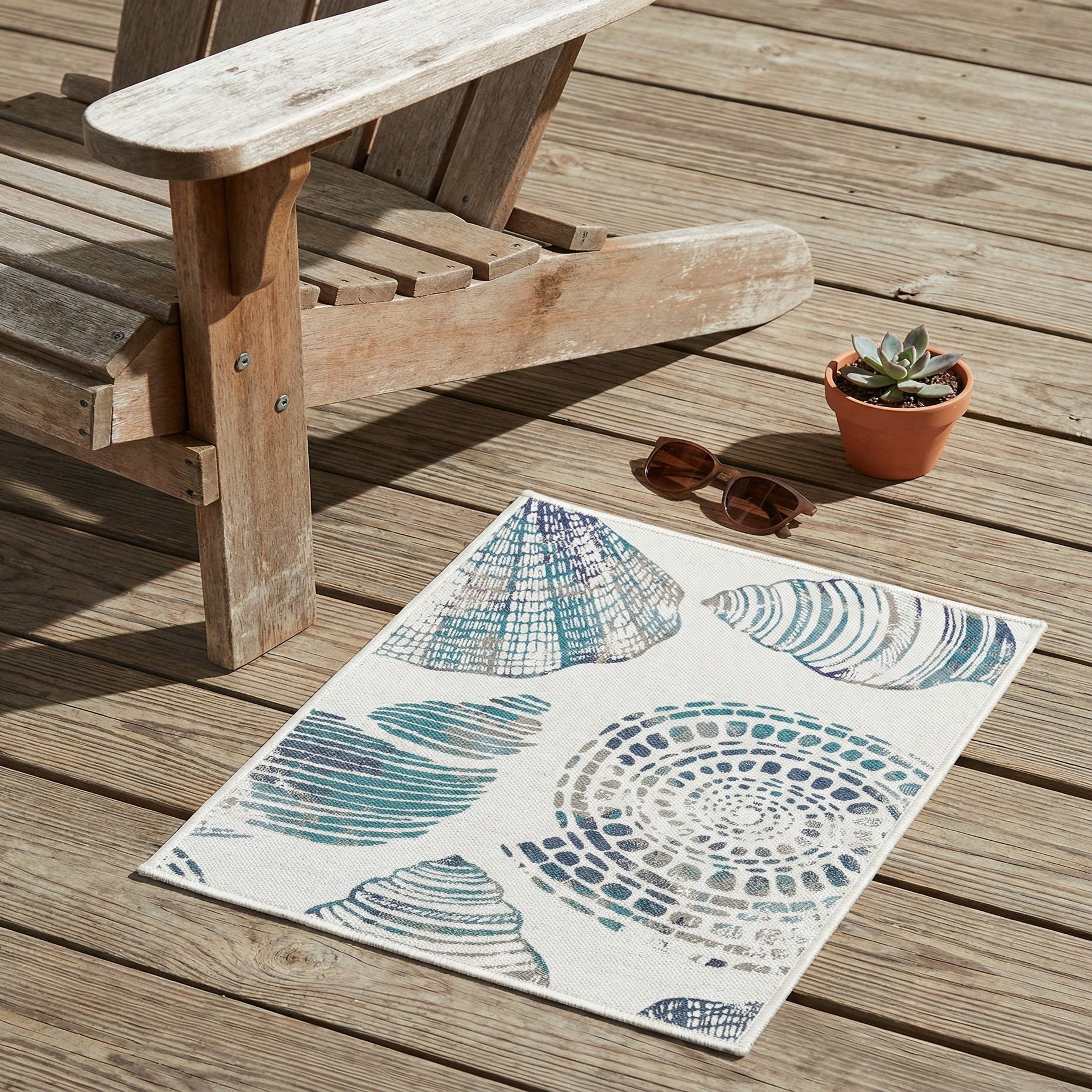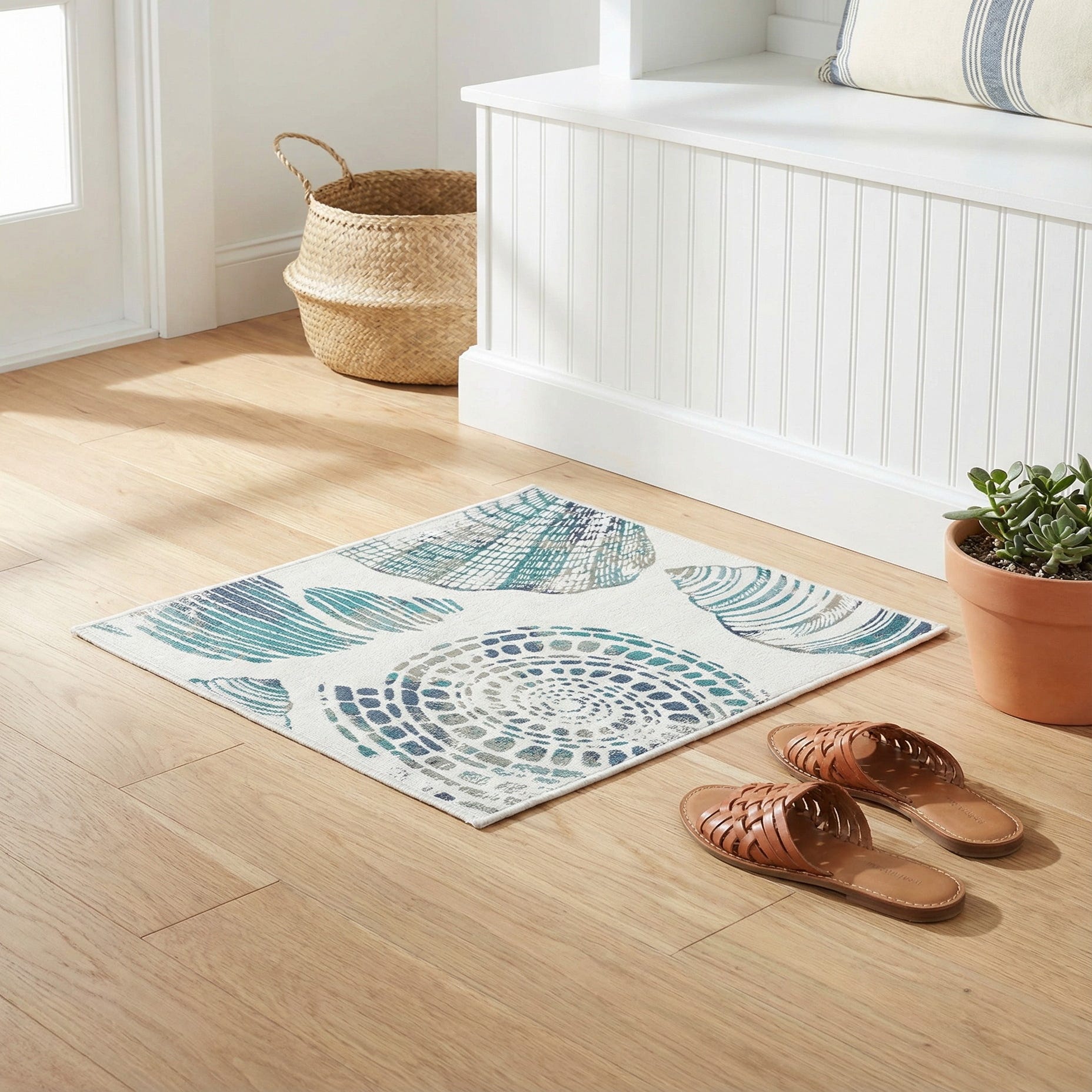 Works well in casual, coastal-inspired spaces such as a sunroom, screened porch or beach house living area, and pairs naturally with light woods, rattan or white slipcovered seating. Use it under a small dining table on a covered patio, layered with natural fiber rugs for added dimension, or as an entry anchor to bring a fresh, seaside palette into a foyer.