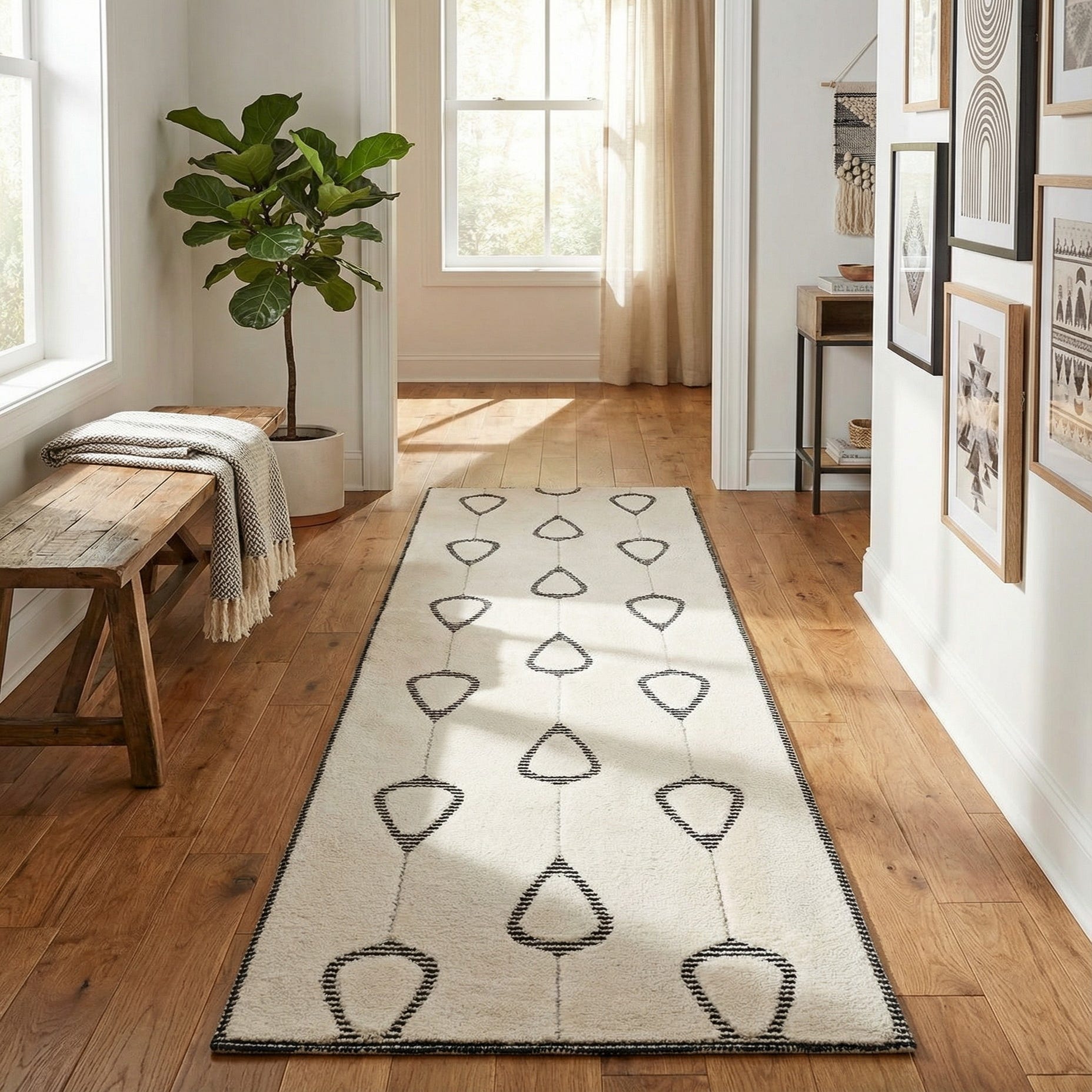 A 10 ft runner rug in ivory with a modern pattern of black striped teardrop shapes connected by thin lines, perfect for a hallway.