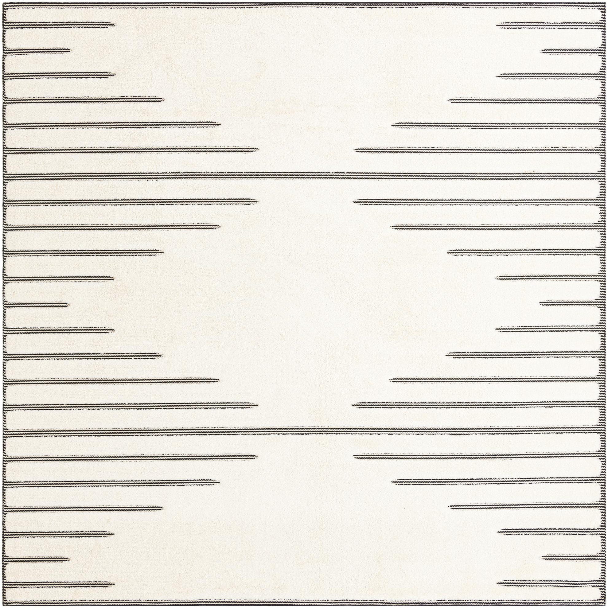 A 10x10 square ivory and cream rug with a modern abstract pattern of horizontal black lines on a white background.