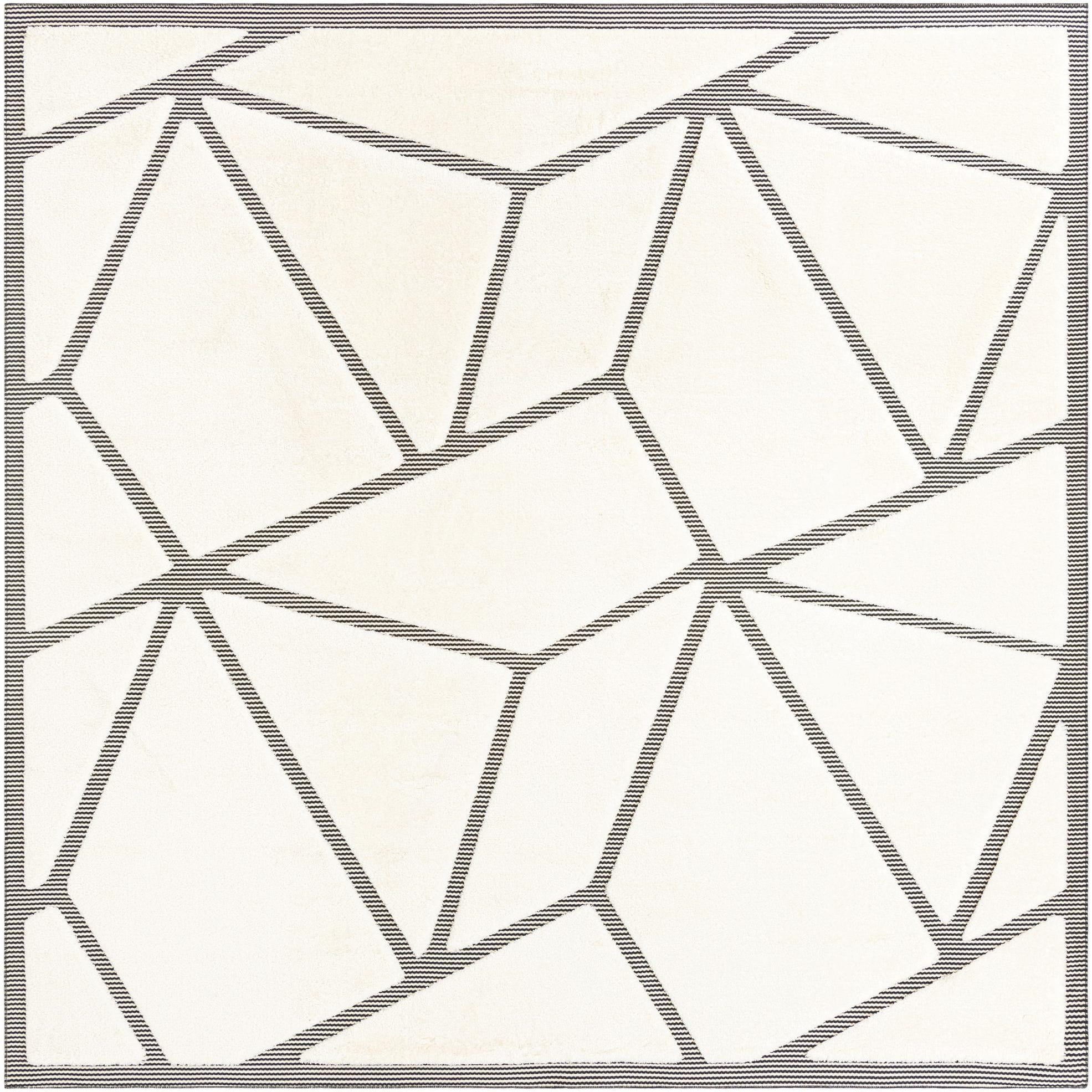 A 10'x10' square ivory and cream rug with a modern geometric pattern of thin black lines, suitable for an indoor patio.