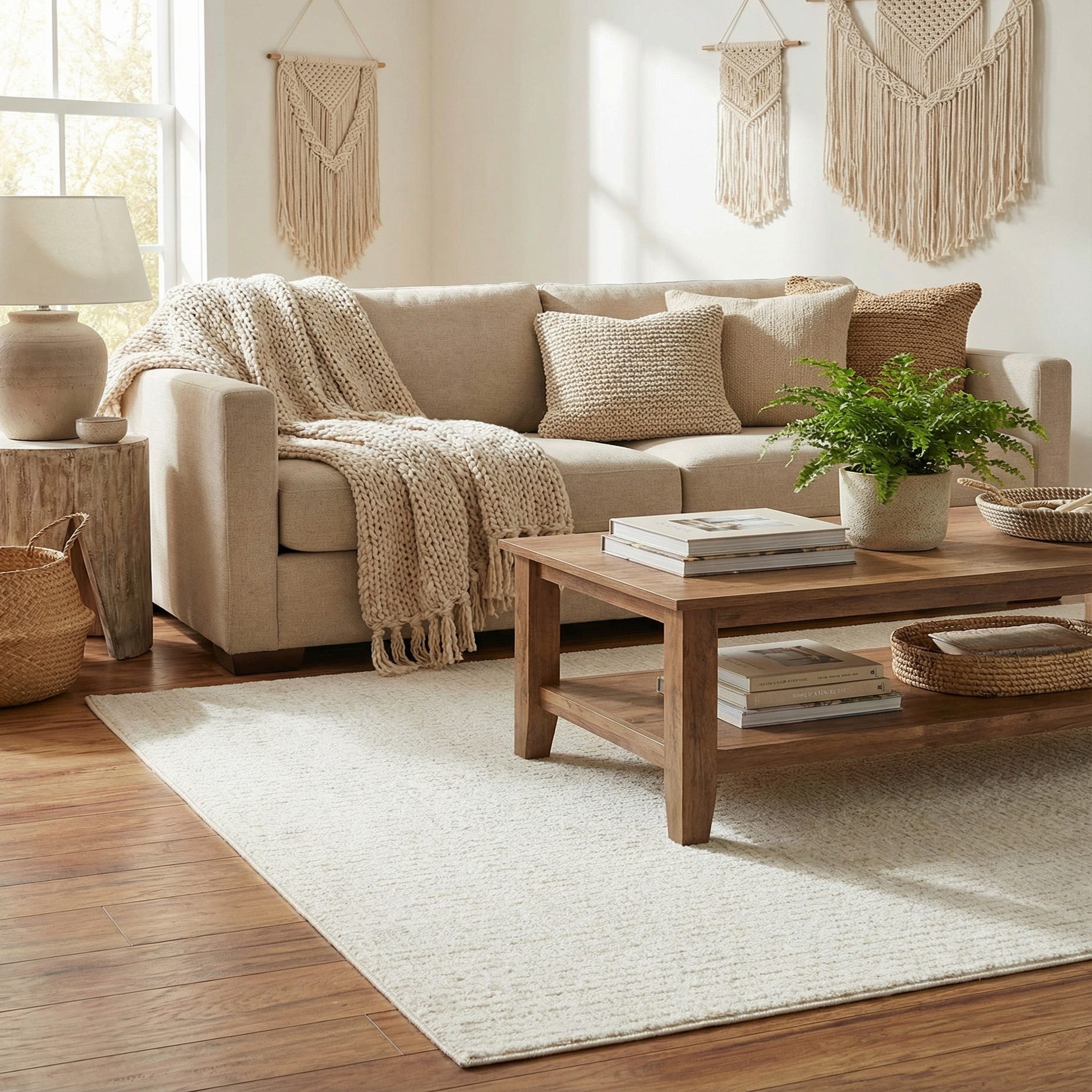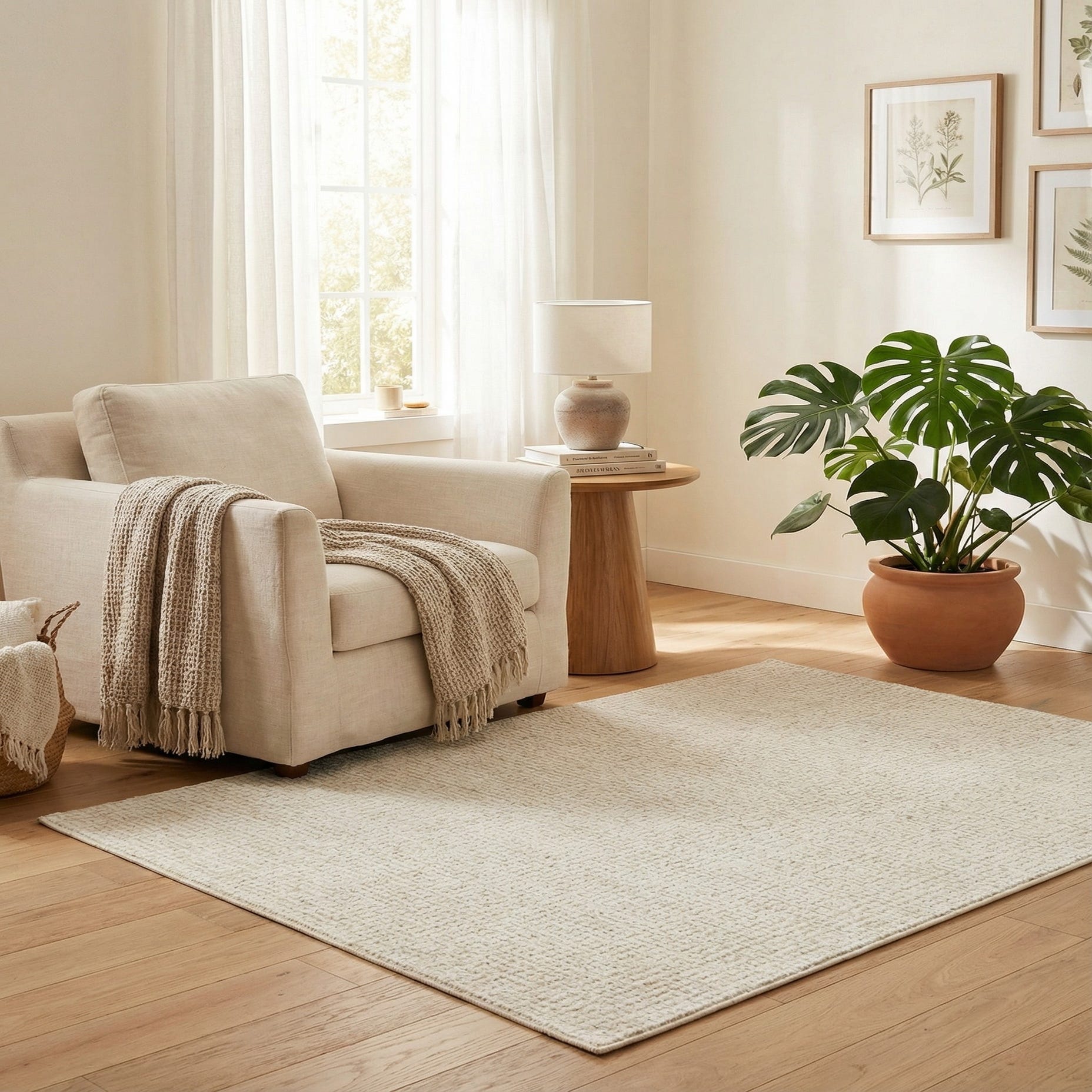 Machine-made from 85% polypropylene and 15% chenille, the rug has a low-profile pile with a soft, slightly velvety hand—chenille provides a gentle, tactile surface while polypropylene gives structure and consistent color. Its neutral palette and restrained pattern work well in contemporary, Scandinavian, or coastal interiors and pairs nicely with natural woods, light metals, and layered textiles. Use it to anchor a cozy seating area, soften a bedside vignette, or add a tactile layer to a reading nook or small dining spot.