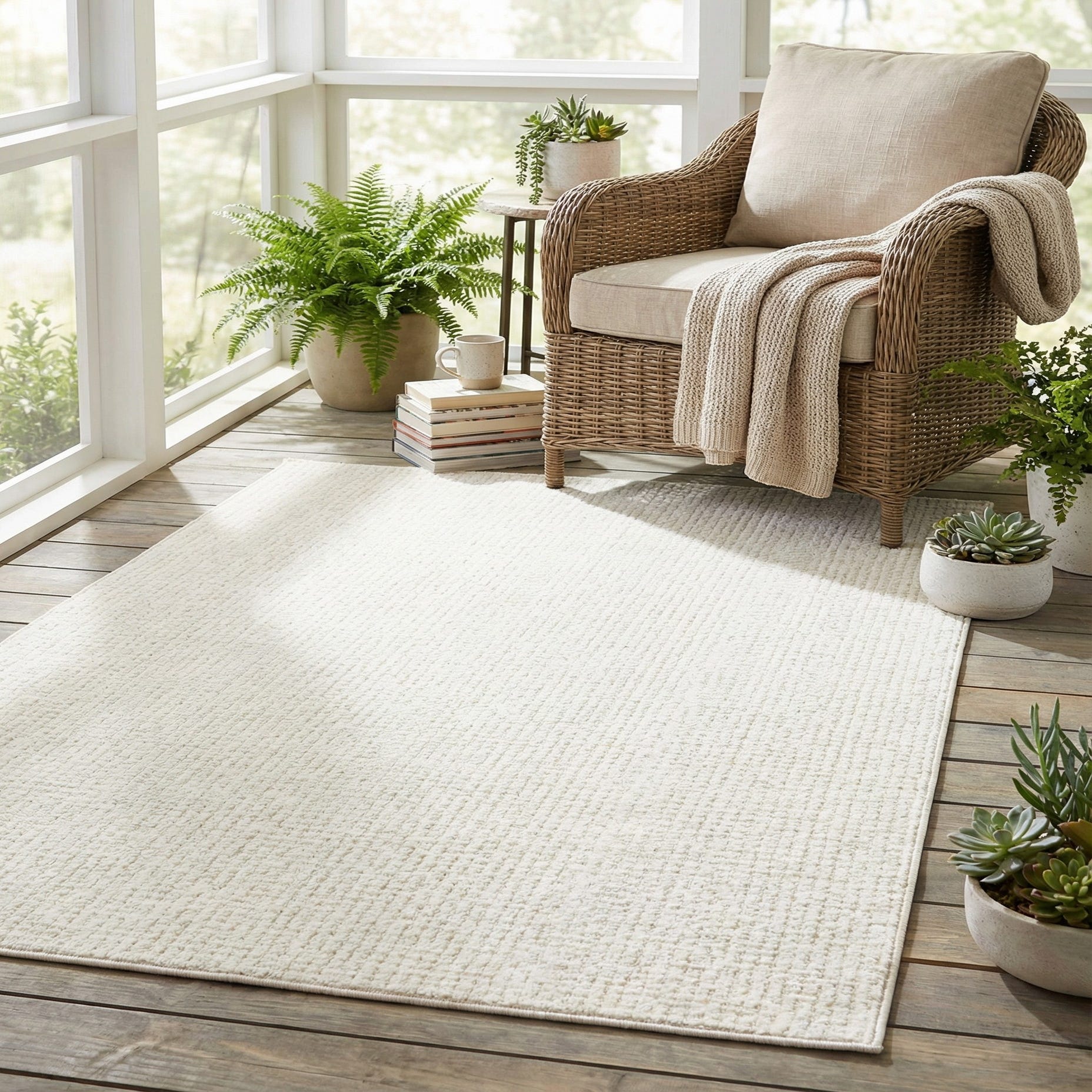 A 4x6 rectangular ivory and cream rug with a subtle textured grid pattern, perfect for a modern living room.