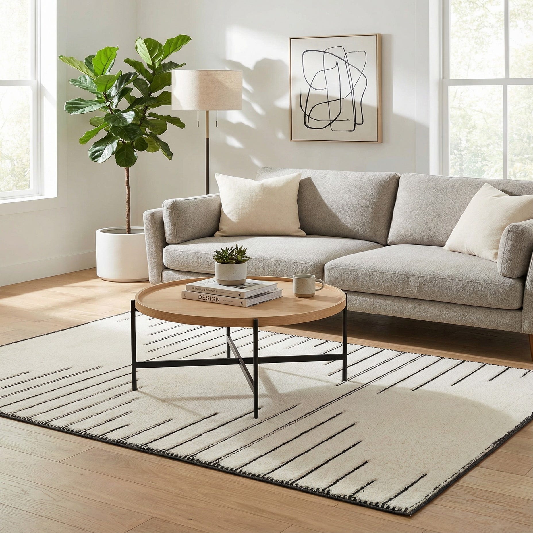 A 4x6 rectangular ivory and cream area rug with a textured medium pile, featuring horizontal black dashed lines forming an abstract border on the left and right sides.