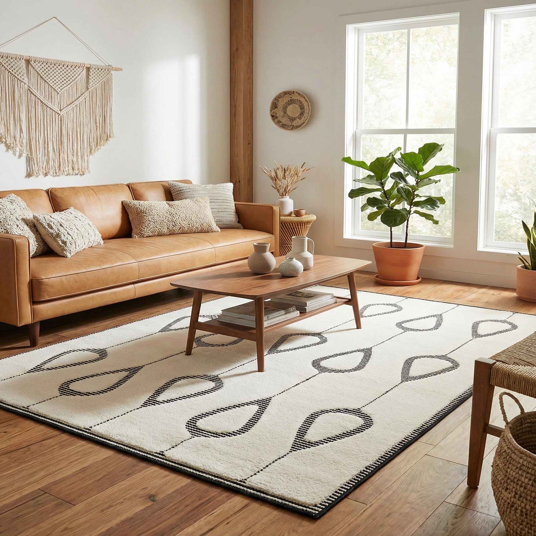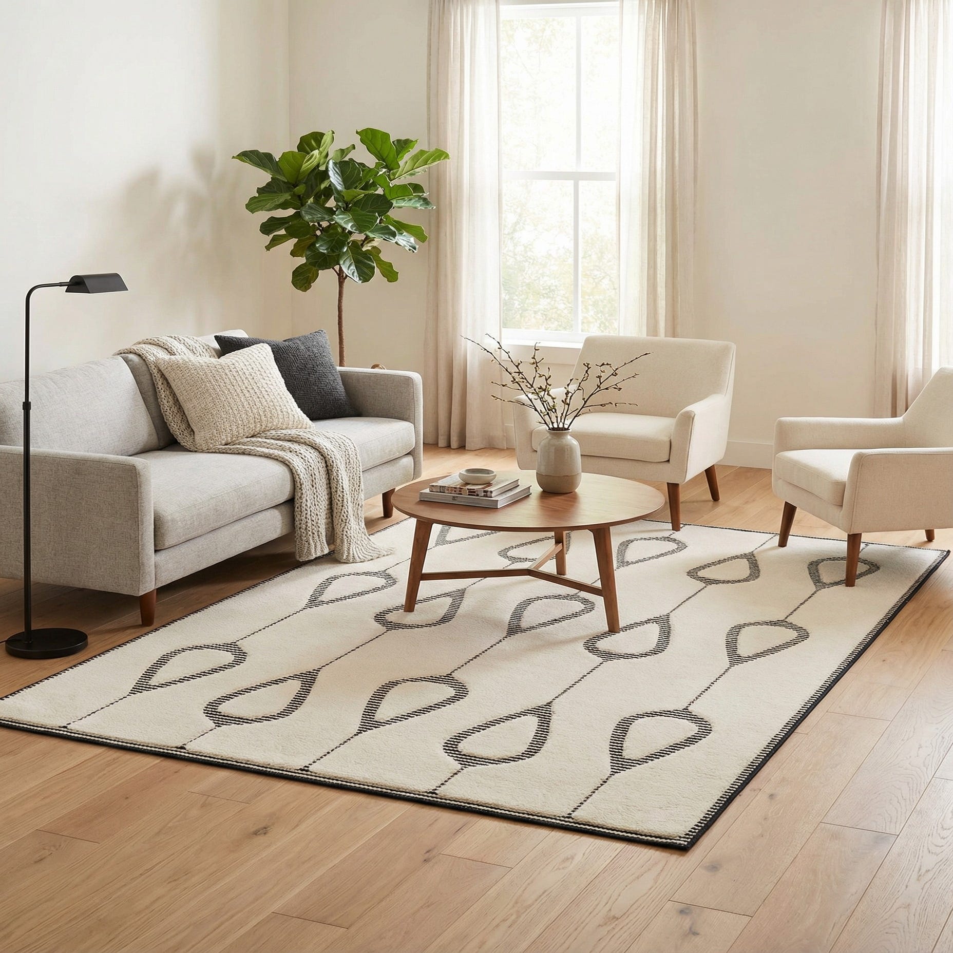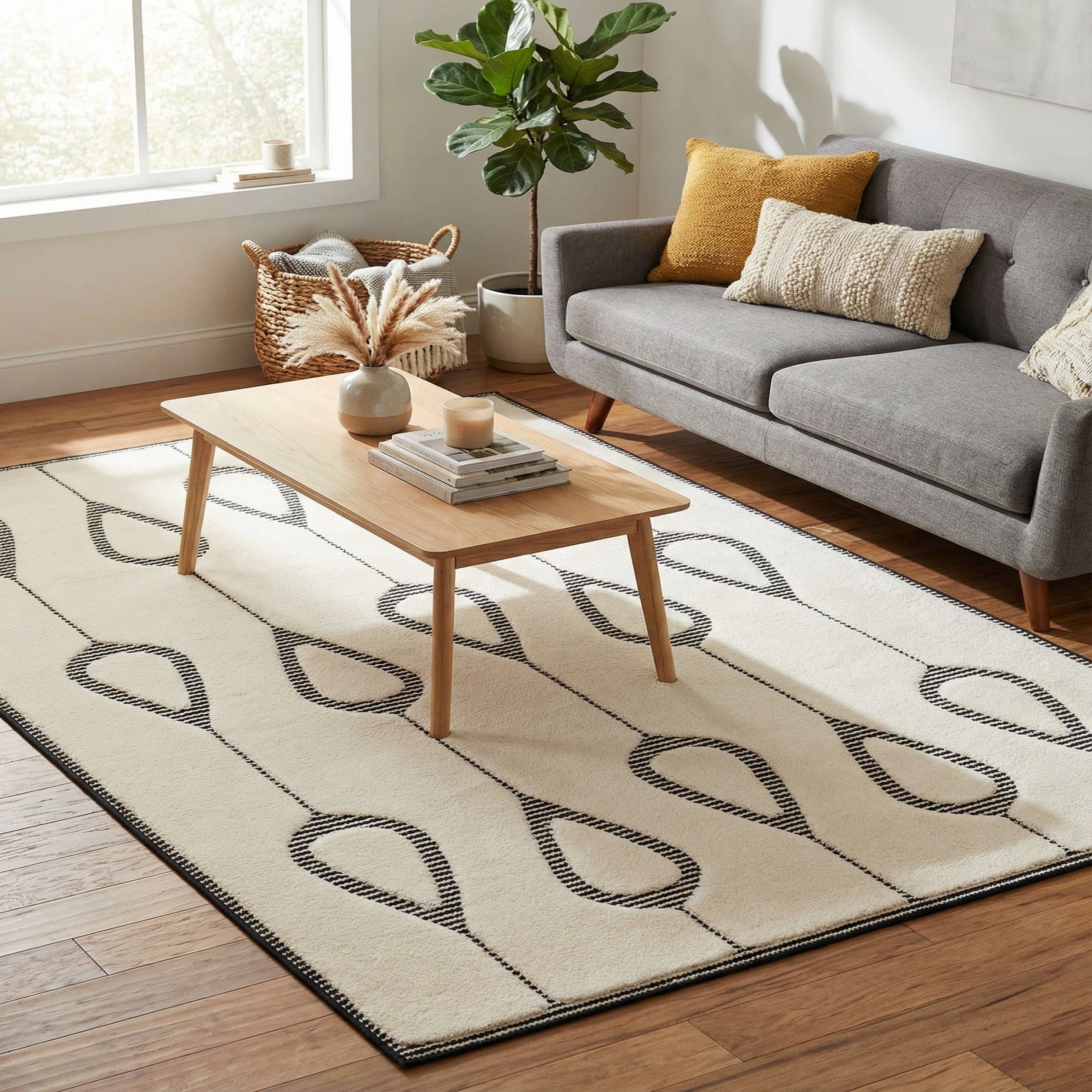 A 5x7 rectangular ivory rug with a repeating pattern of black, wavy, teardrop-like shapes connected by thin black lines, suitable for a living room or bedroom.