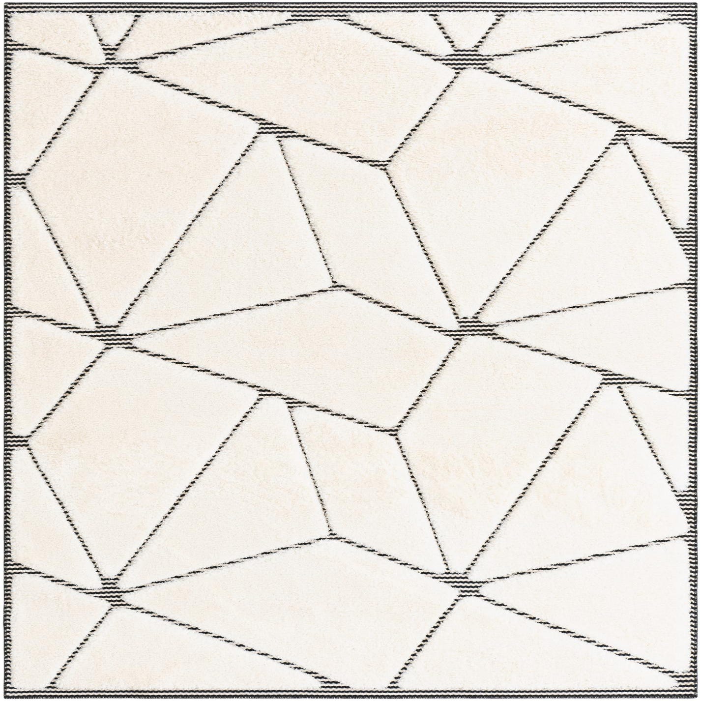A 5x7 rectangular ivory and cream area rug with a modern geometric pattern of black lines, suitable for a living room or bedroom.
