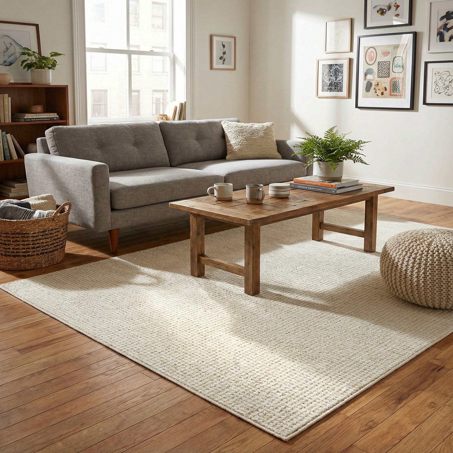 This rug works well in modern, Scandinavian, or transitional interiors where a neutral base is needed to balance furniture and finishes. Place it under a coffee table to warm light wood floors, layer it beneath a bed to soften a bedroom, or use it in a home office to brighten the room without competing with other textiles. It pairs nicely with linen upholstery, matte metal accents, and natural wood tones for a quiet, cohesive look.