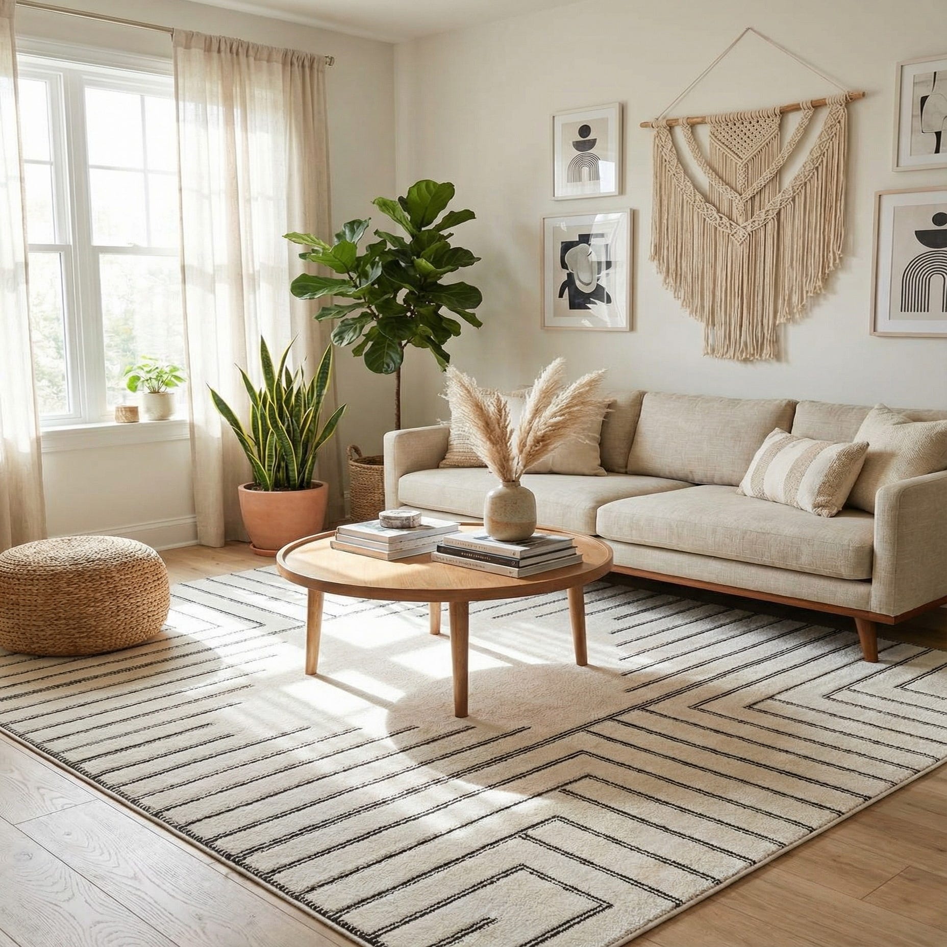A square ivory and cream rug with a modern abstract pattern of horizontal black dashed lines on the left and right edges, suitable for an indoor space.