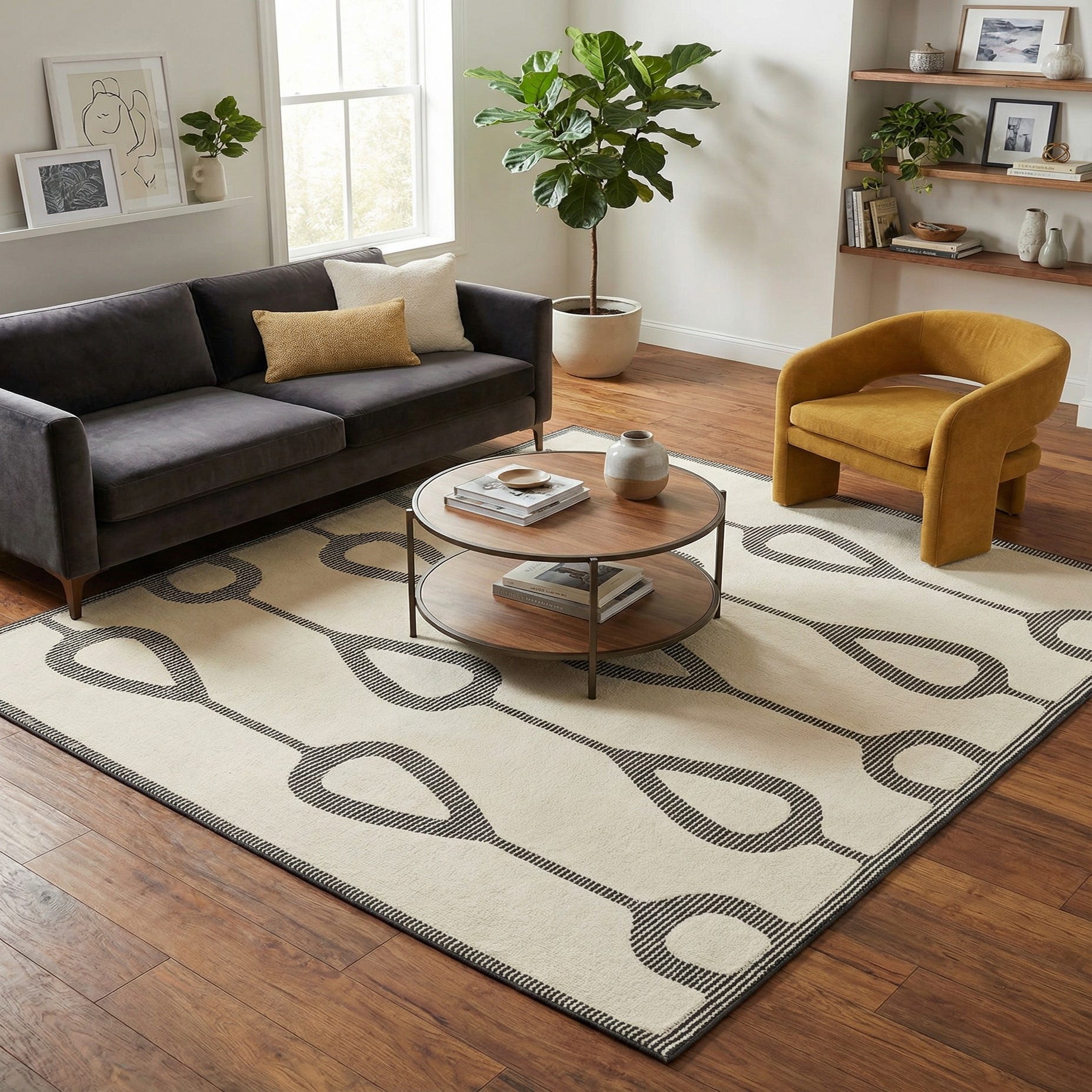 A 7' 10 x 7' 10 square ivory and black rug with a bold, modern geometric chain-link pattern.
