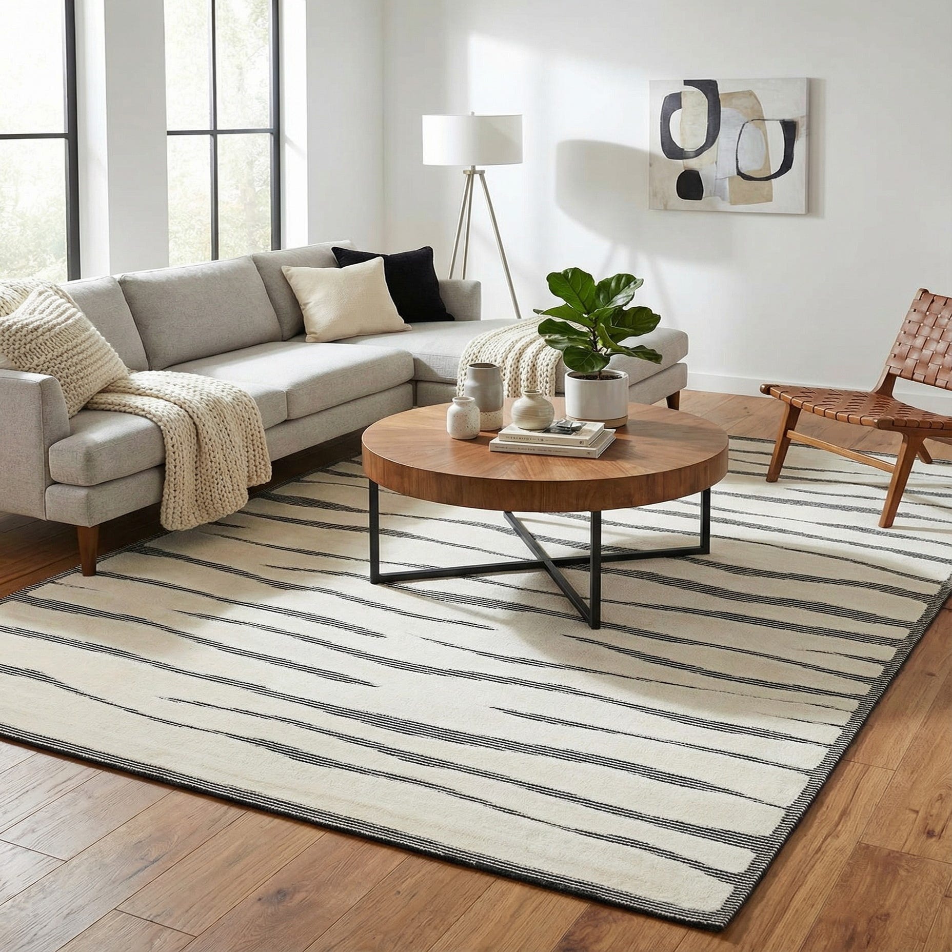 A 9x12 rectangular ivory and cream area rug with textured black horizontal stripes, ideal for a living room.
