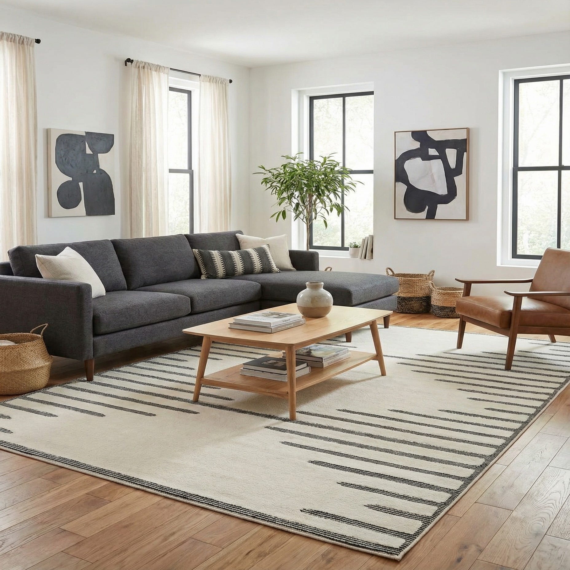 A 9x12 rectangular ivory rug with a modern abstract pattern of horizontal black lines along the left and right edges.