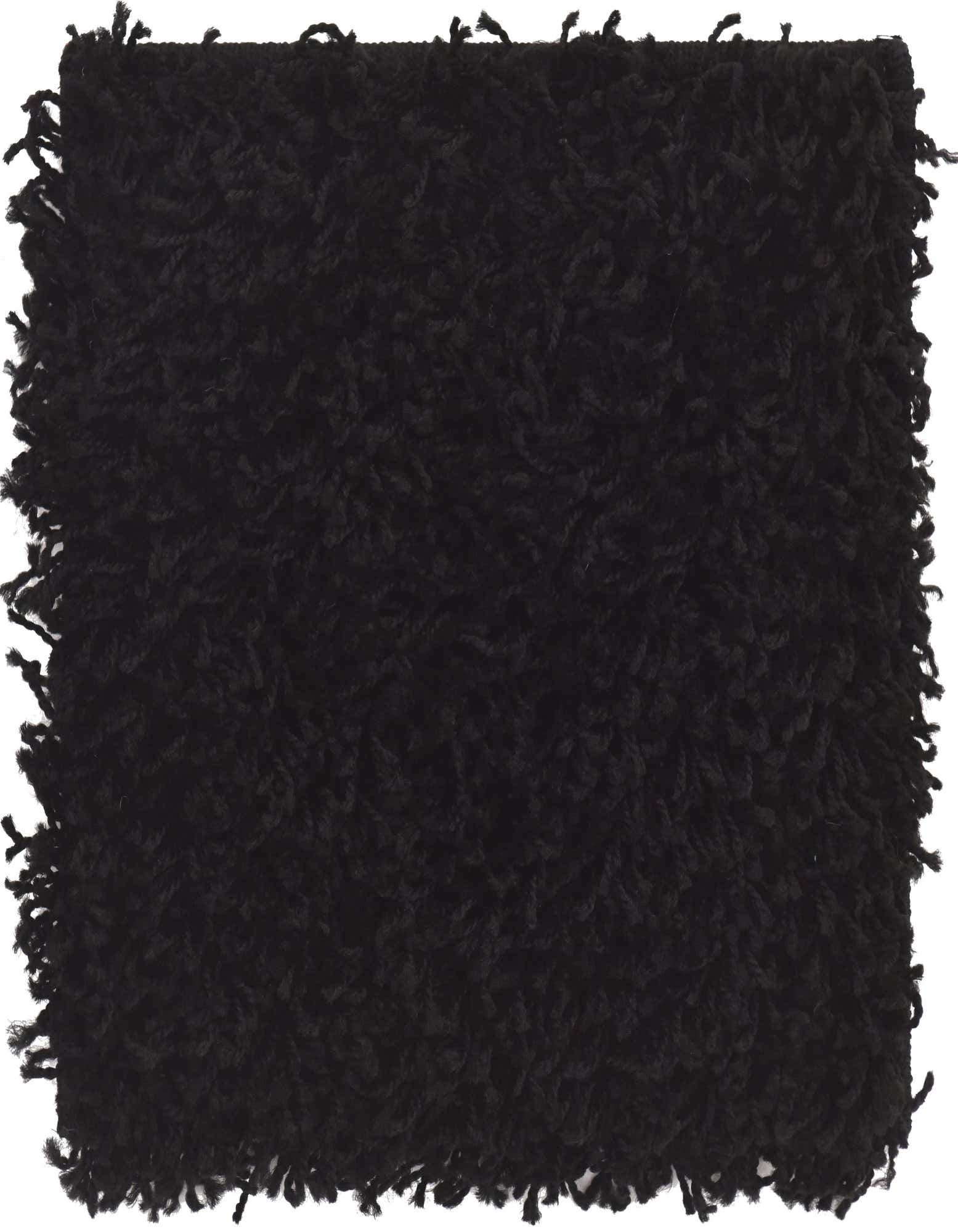 A solid shag in deep Jet Black, this rug presents a uniform, high-pile surface with long, twisted yarns that create a tactile, plush feel. The lack of a printed motif keeps the look clean and modern, while the dense, curly fibers add visual depth and a soft, cushioned surface underfoot. The overall style reads contemporary with a relaxed, cozy character.
