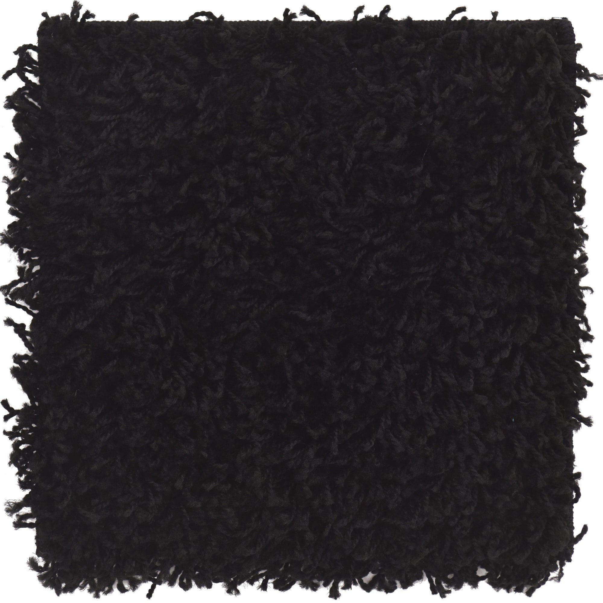 A small, square black shag rug sample with a plush, textured pile, perfect for testing color and feel.