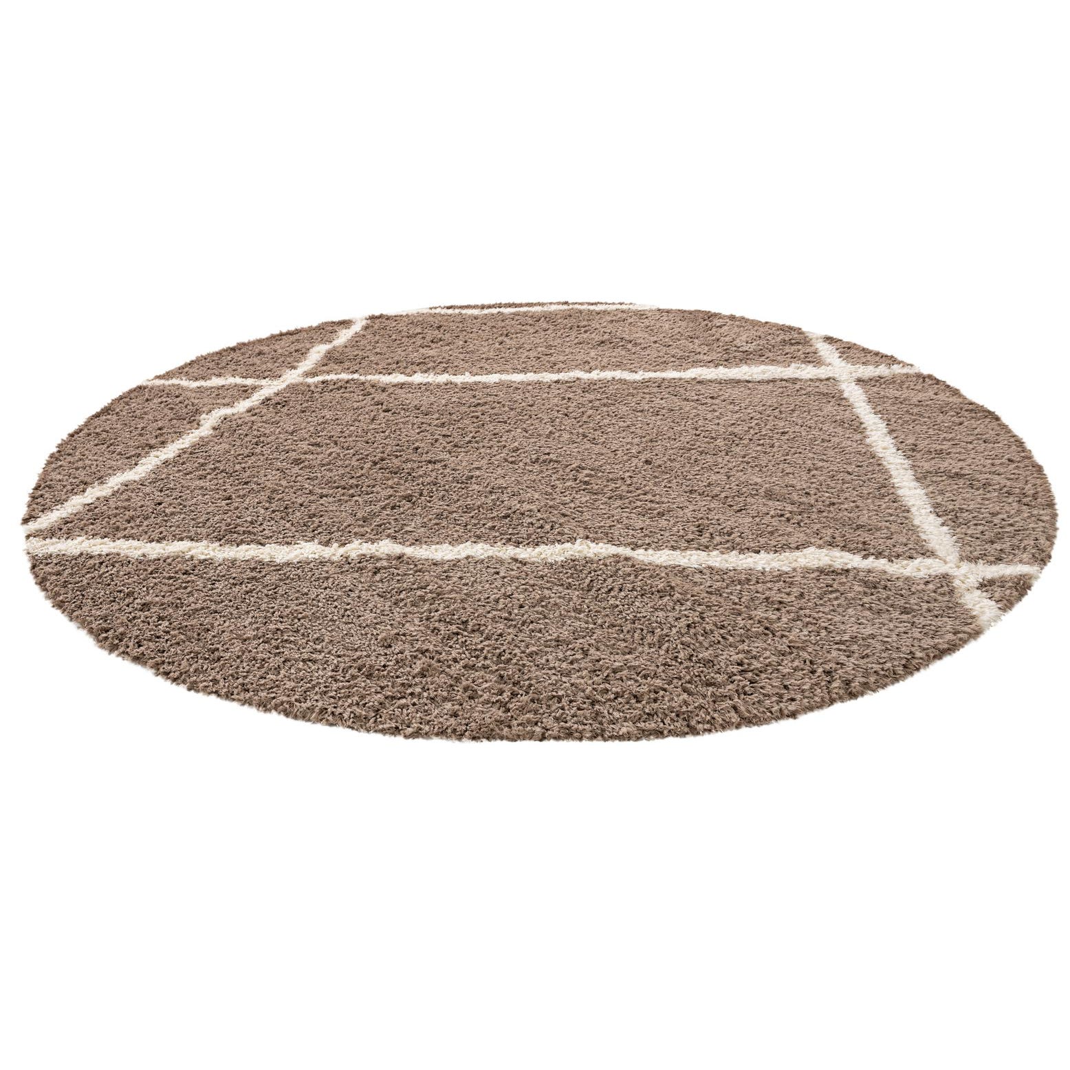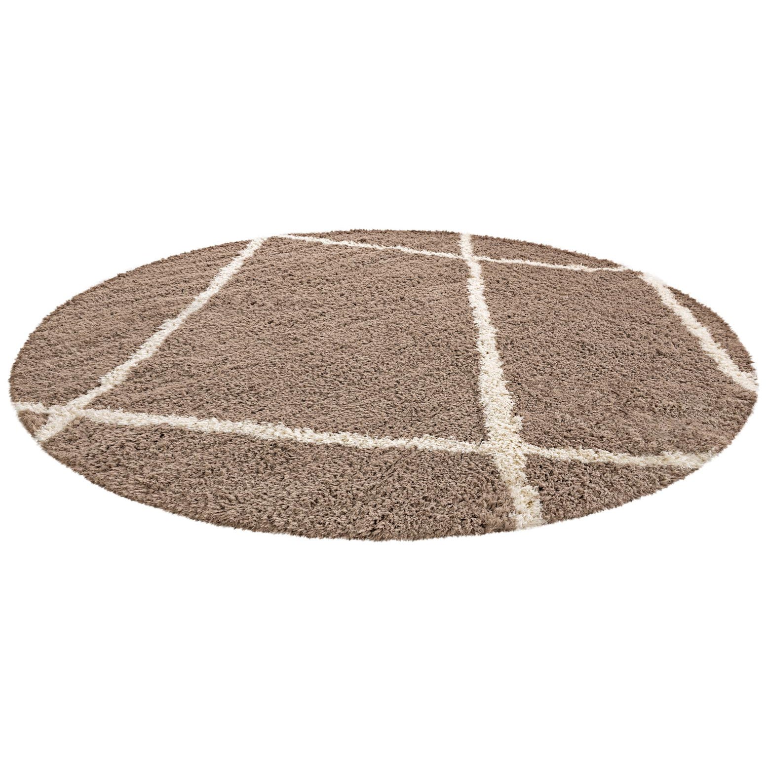 A 10-foot round brown shag rug with a modern ivory geometric crisscross pattern, ideal for a living room or bedroom.