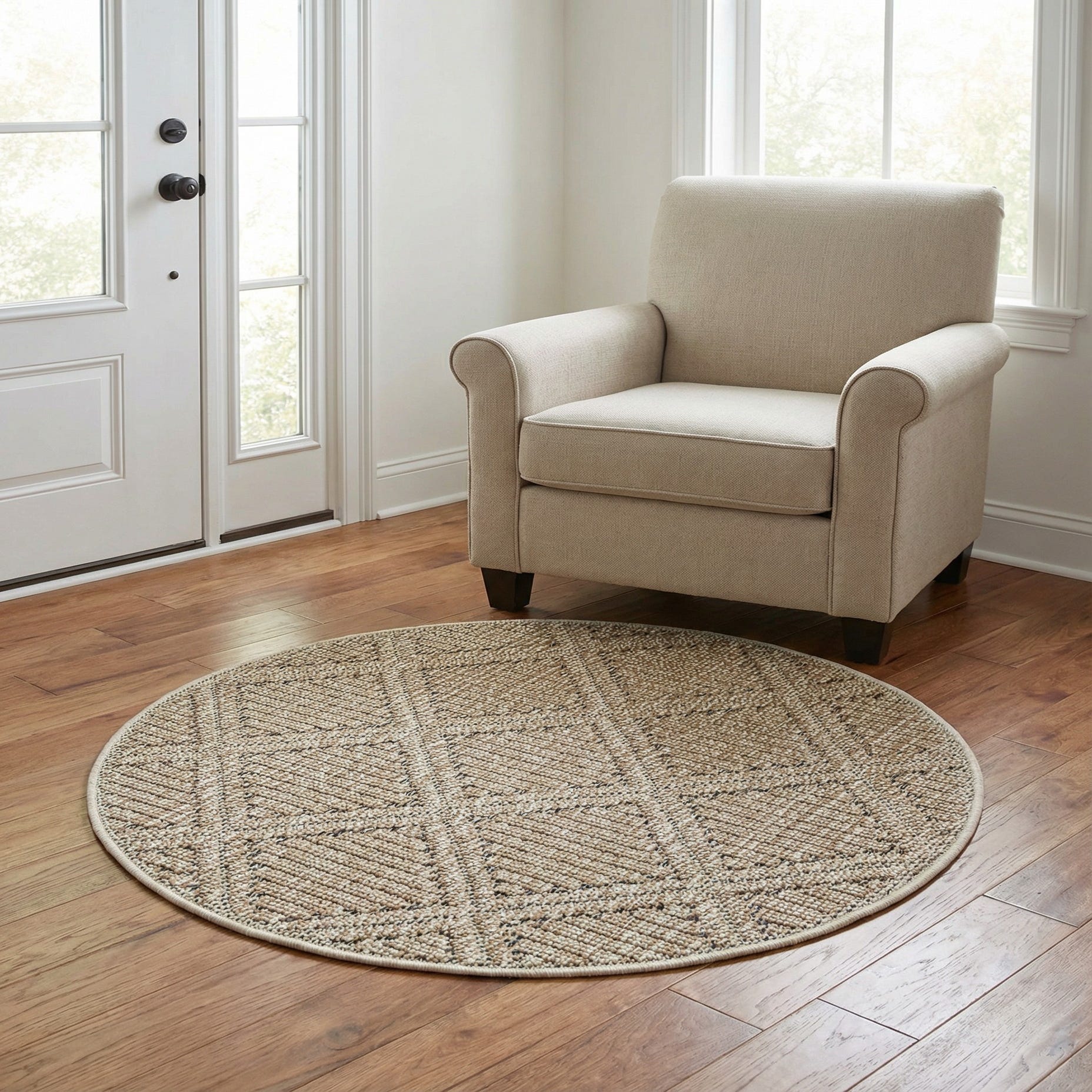 Made from 100% polypropylene, this piece pairs naturally with casual, coastal, or transitional decor—think a wicker bistro set on a covered porch, a sunroom with linen upholstery, or a neutral living area anchored by natural wood and rattan accents. Its neutral palette and geometric pattern also work well layered over a larger sisal-style rug or centered beneath a small seating group or entry console to define the space.
