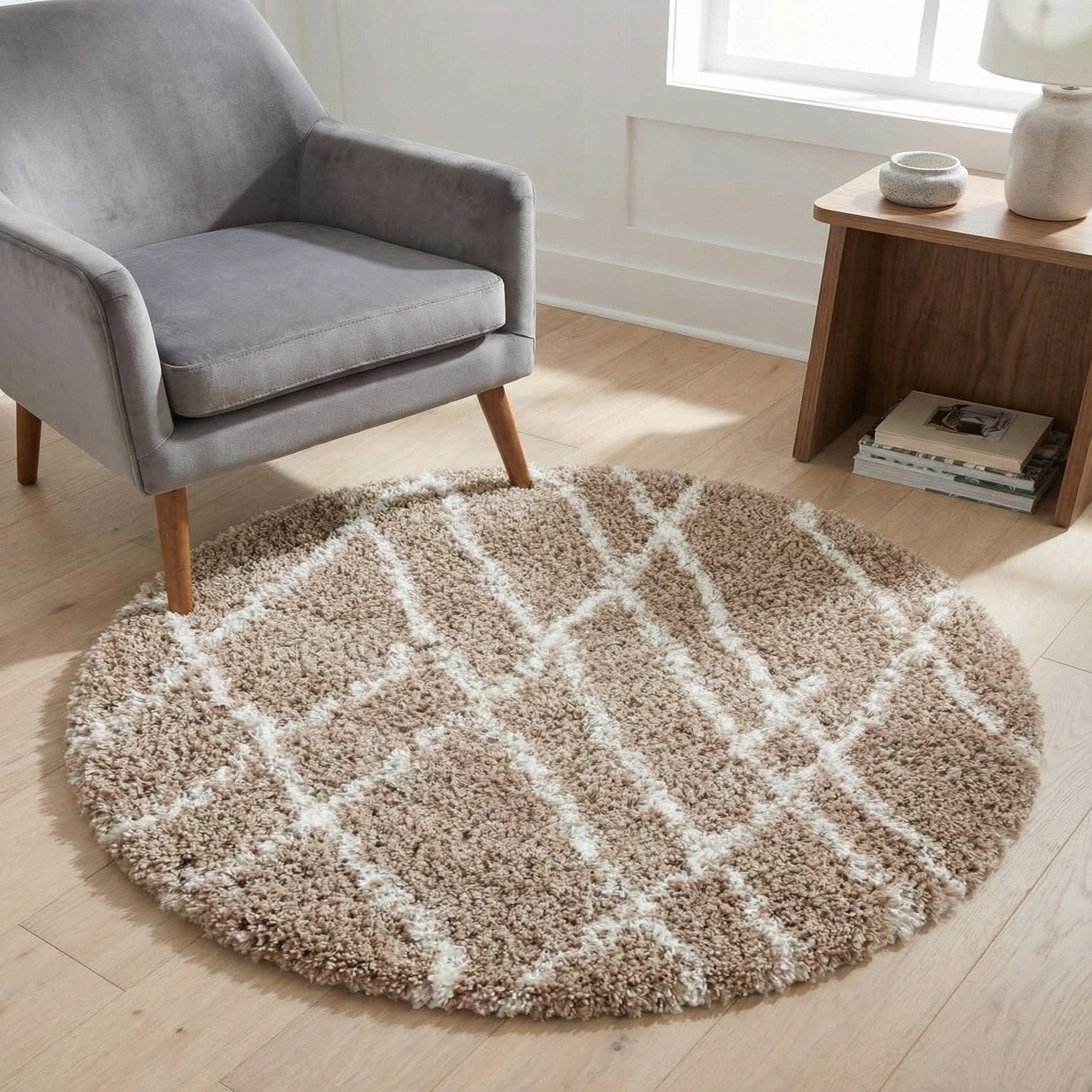 This rug pairs naturally with casual and transitional interiors — think light-wood floors, linen upholstery, and soft metallic accents. Use it to anchor a cozy seating area, soften a bedroom floor at the foot of the bed, layer under a small round table, or add warmth to a reading nook or nursery. Its neutral palette and simple pattern work well with coastal, modern farmhouse, Scandinavian, or boho-inspired schemes.