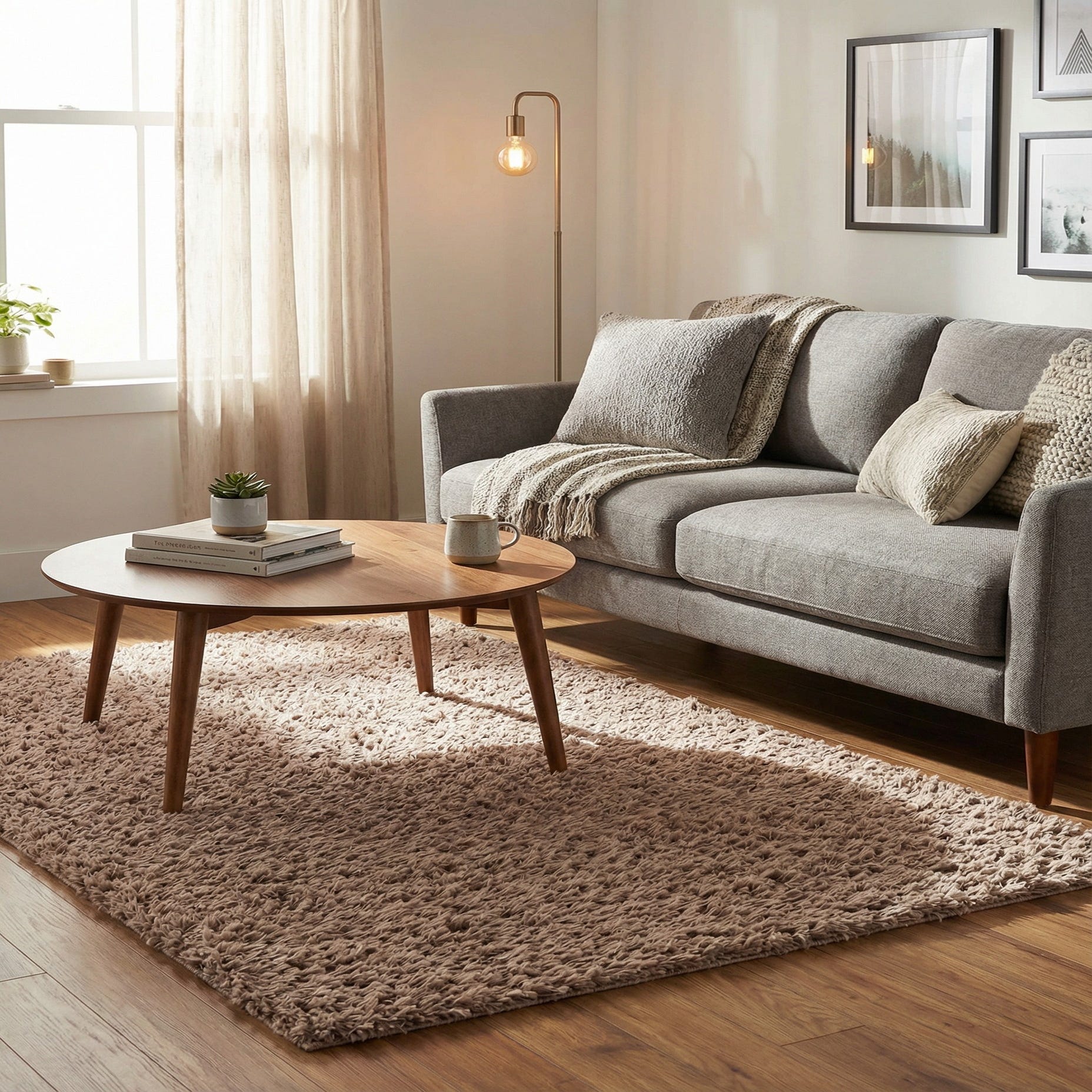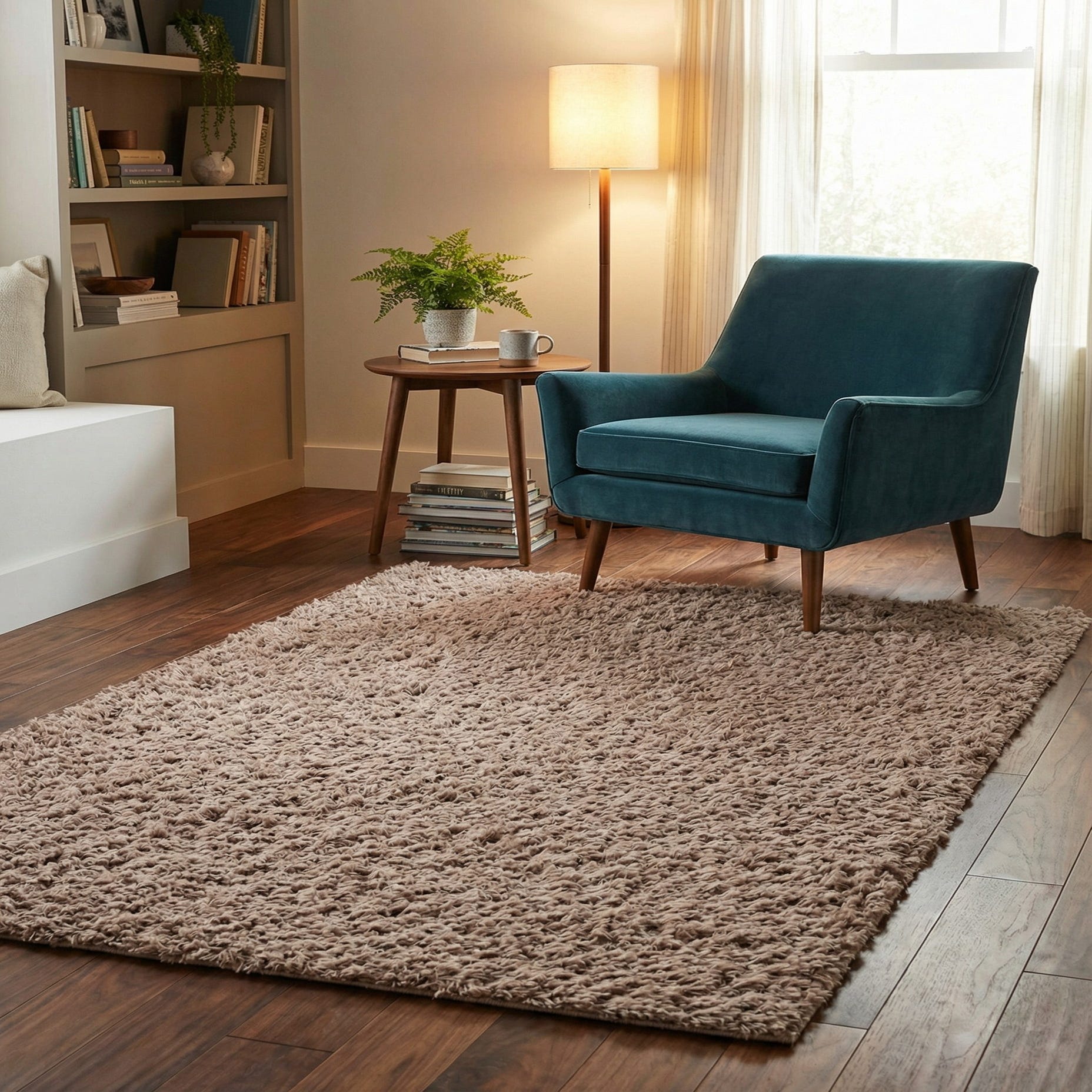Pair this rug with neutral sofas and natural wood furniture for a calm, contemporary living area, or layer it under a low-profile coffee table to soften a small seating arrangement. It also works well in a bedroom or reading nook where a warm, tactile surface helps define the space, and complements modern, transitional, or casual décor schemes that favor understated color and texture.