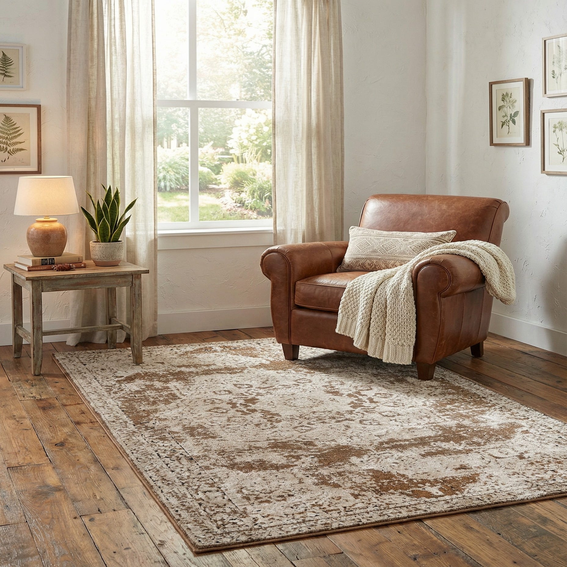 A 4x6 rectangular Eliza collection rug featuring a distressed medallion pattern in brown, tan, and ivory.