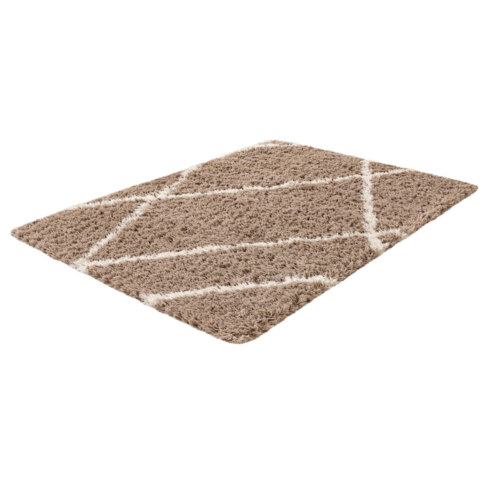 A 4x6 rectangular brown shag rug with a modern ivory diamond pattern, suitable for a living room or bedroom.