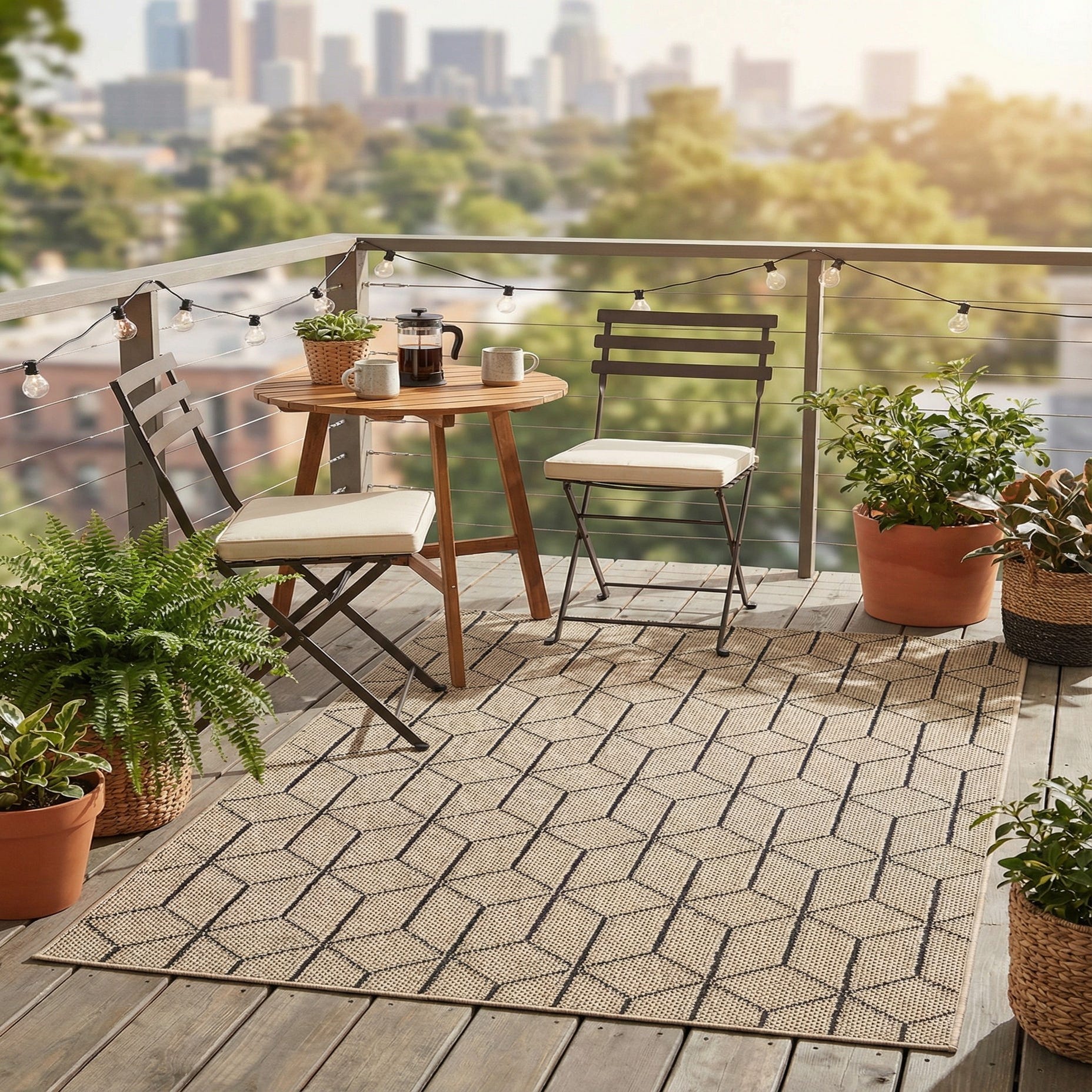 A 4x6 rectangular indoor/outdoor rug featuring a modern trellis pattern in tan and dark brown, with a flat pile.