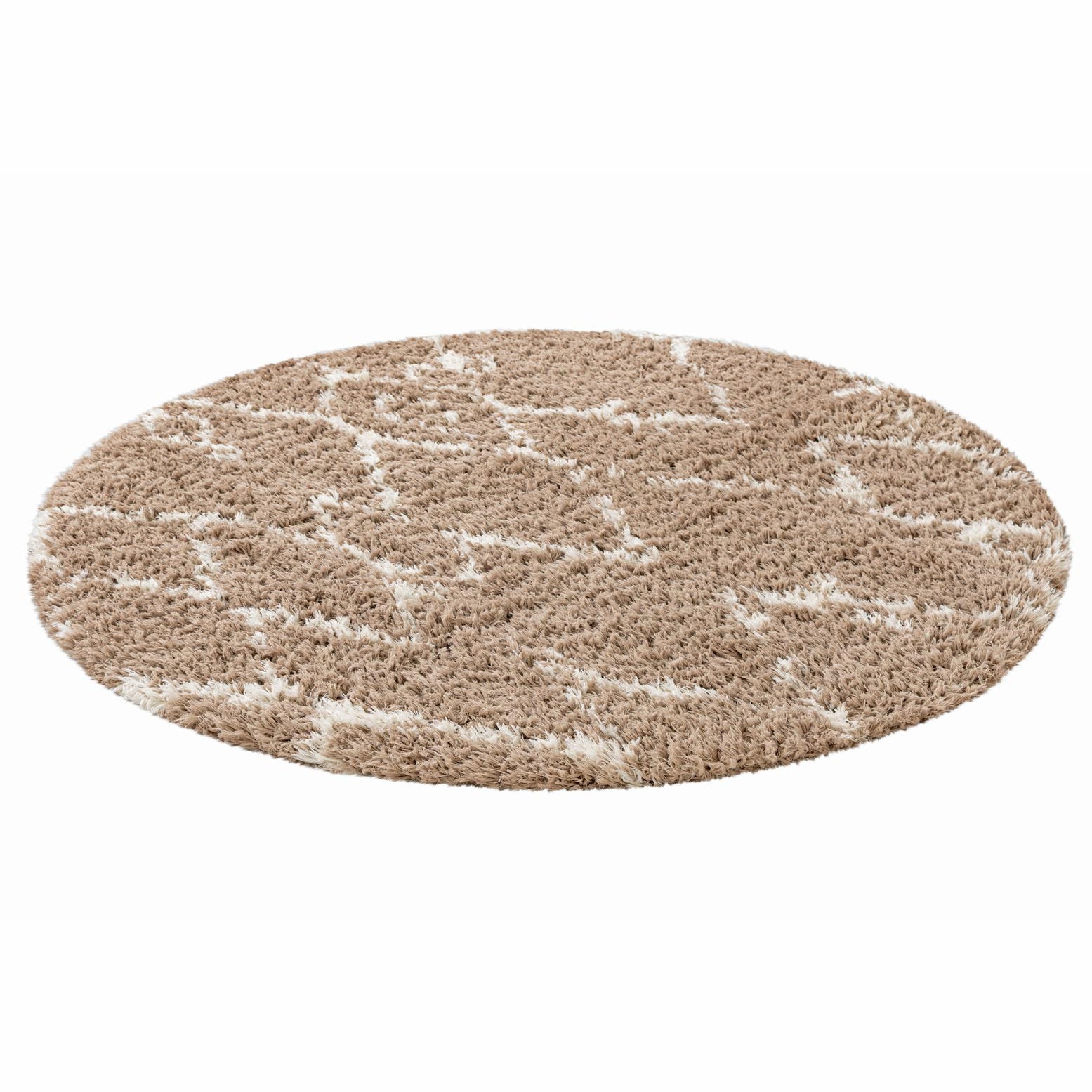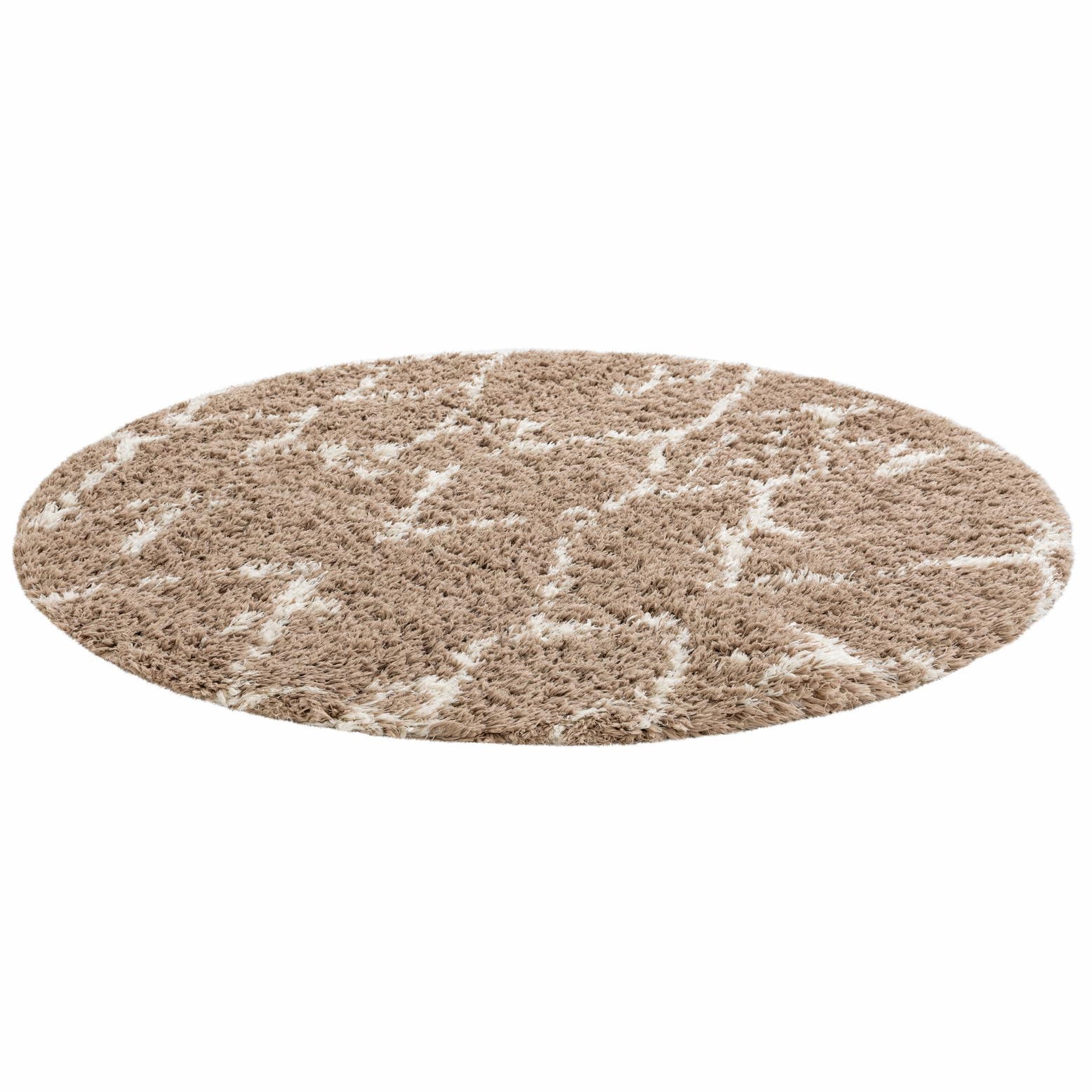 A round 5' 0 x 5' 0 brown shag rug with an ivory modern geometric pattern, suitable for indoor spaces.