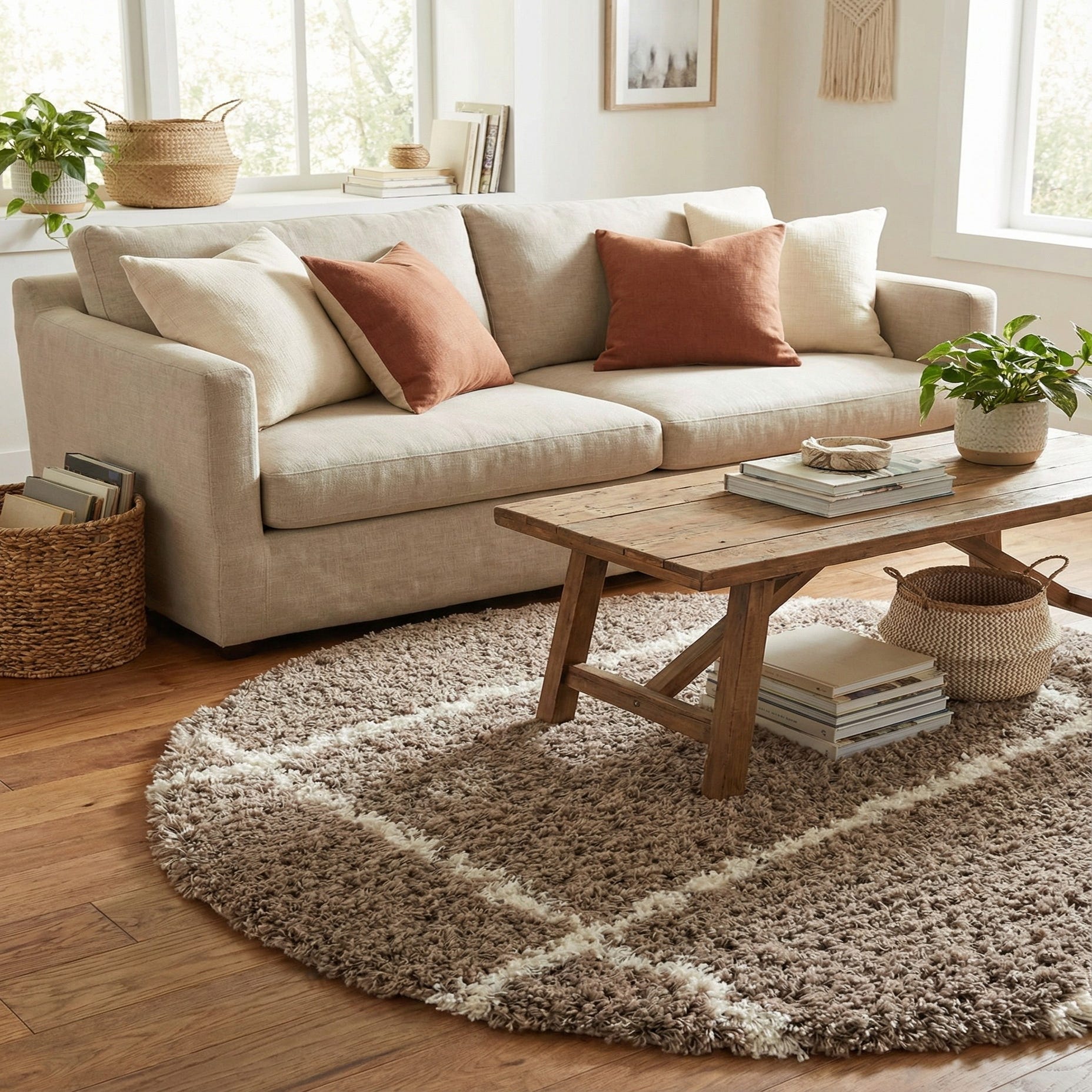 A round 5' brown shag rug with a modern ivory geometric crisscross pattern, ideal for a living room or bedroom.