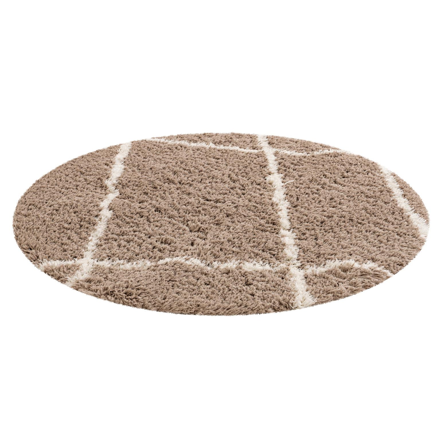 A round 5' brown shag rug with a modern ivory geometric crisscross pattern, ideal for a living room or bedroom.
