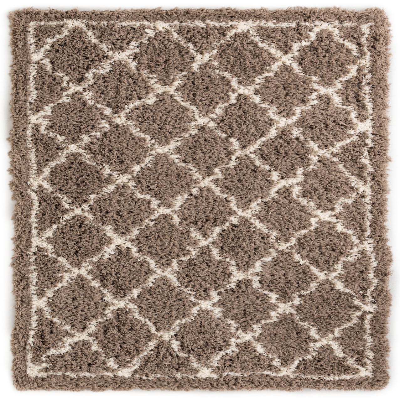 A 5x8 rectangular Infinity Shag rug in brown and ivory, featuring a modern geometric trellis pattern.